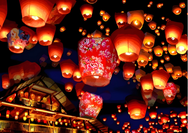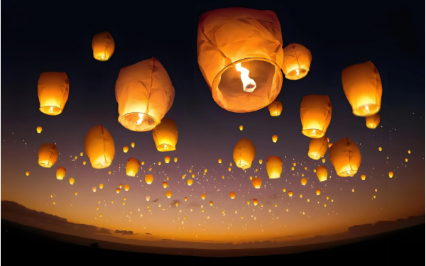 “放天燈”,來(lái)由是過(guò)去人們?cè)诙惚鼙I匪侵襲而四散逃逸之后,以燃放天燈為互報(bào)平安的信號(hào)。由于避難回家的日子正是元宵節(jié),從此以后,每年這一天,人們便以放天燈的儀式來(lái)慶祝,所以又稱天燈為“祈福燈”或“平安燈”。其后逐漸演變?yōu)橄蛏咸炱砀TS愿的民俗活動(dòng)。天燈上寫滿了心里的各種祈愿,希望天燈能上達(dá)天庭,帶給人無(wú)限的希望和光明。