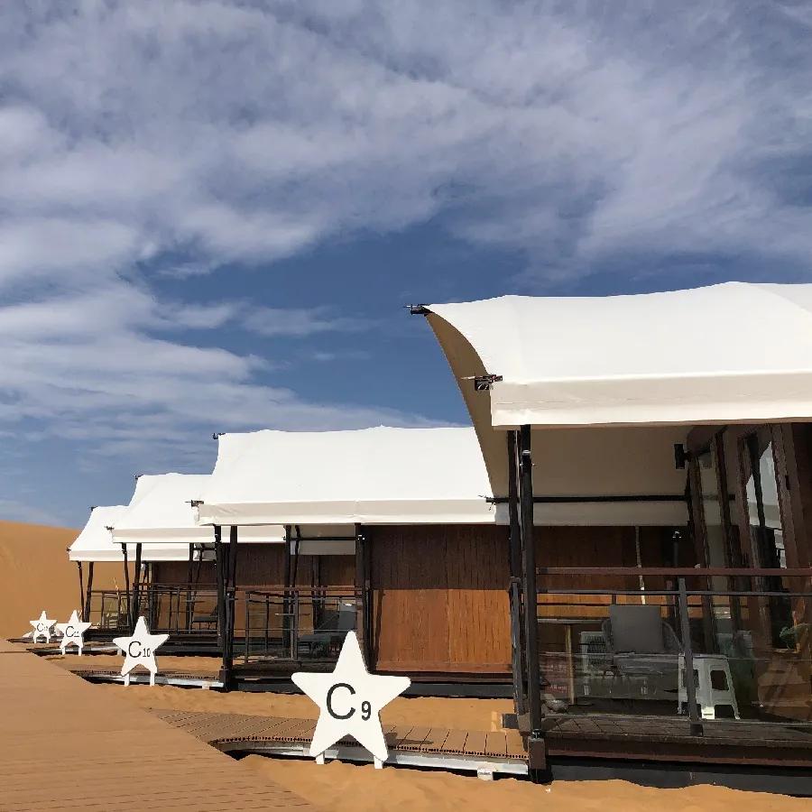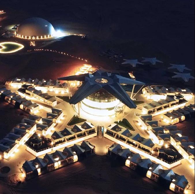沙漠星星酒店沙漠星星酒店是國內(nèi)首個以沙漠觀星為主題的酒店,它坐落在寧夏省中衛(wèi)市沙坡頭旅游度假區(qū)內(nèi),以五角星形狀規(guī)劃設(shè)計,從空中俯瞰正形如一顆顆星星。遠遠看到的第一個建筑則是一個巨大無比、白色的半球體,這是酒店的標(biāo)志性建筑——星星劇場的穹頂。及至近前是起伏沙丘上的一棟棟設(shè)計感十足的精致木屋鱗次櫛比;一面全是玻璃幕墻的觀景房遙遙相對;還有星球穹頂?shù)挠^星房;“半個太陽的驚喜”落日餐廳。餓了,就來一頓獨具特色的沙漠晚餐;累了,就住在星星酒店,開啟“躺在床上數(shù)星星”的全新旅游方式。