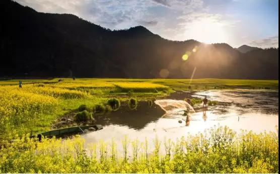午餐后到達慶源,慶源村素有小桃園之稱,長期與世隔絕,民風(fēng)淳厚、景色直人,空氣清新不染纖塵,泉水清澈賦含靈氣。油菜花、梨花和桃花同時監(jiān)開,把慶源人家籠罩在一派“金山、銀海、胭脂云"的最象之中。