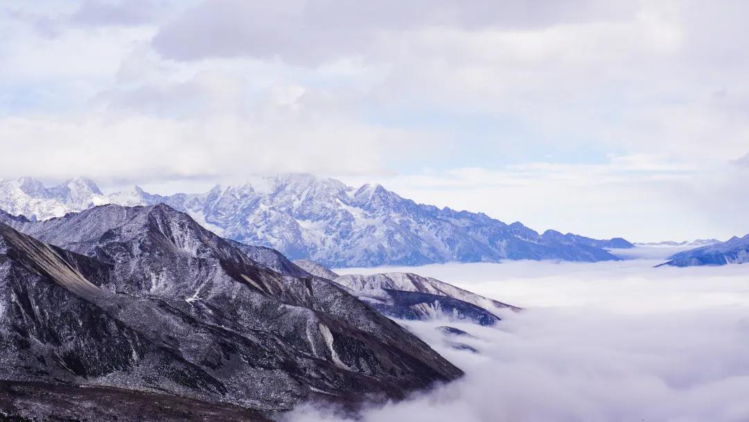 在從鐵匠山剛進入格聶山區(qū)時,格聶群峰橫陳天際,這是遠眺格聶群峰的最佳位置。在這里可以看到三座巨大的雪山從地平線上騰空而起,格聶、肖扎、喀麥隆、庫日崗中等數(shù)座神山從左向右一字排開,像一堵雪山屏障一樣,蔚為壯觀。