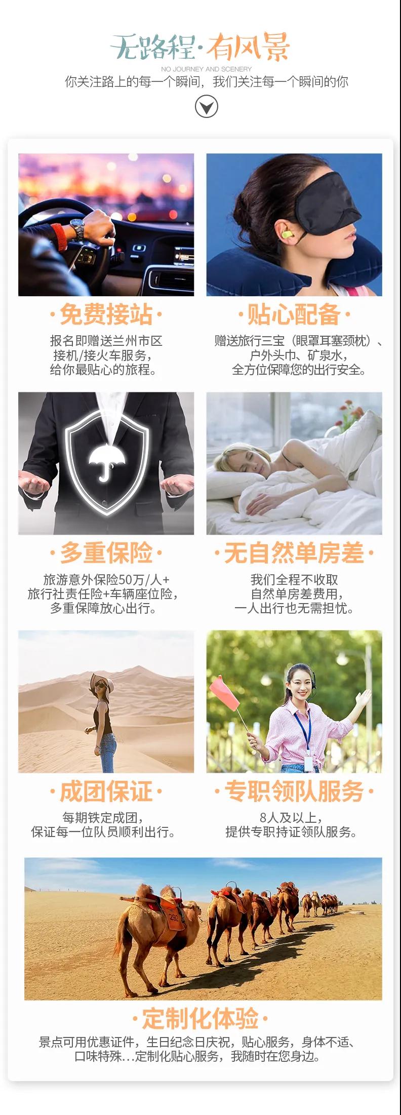1. 敦煌莫高窟景區(qū)自2015年6月起實(shí)行數(shù)字展示中心數(shù)字洞窟展示和莫高窟實(shí)體洞窟體驗(yàn)的預(yù)約參觀模式,每天限6000人參觀,團(tuán)隊(duì)參觀時(shí)間嚴(yán)格按照莫高窟預(yù)約場(chǎng)次進(jìn)行,因此,敦煌段景點(diǎn)參觀順序會(huì)根據(jù)莫高窟時(shí)間進(jìn)行調(diào)整或同團(tuán)客人安排不同時(shí)間游覽,敬請(qǐng)配合。