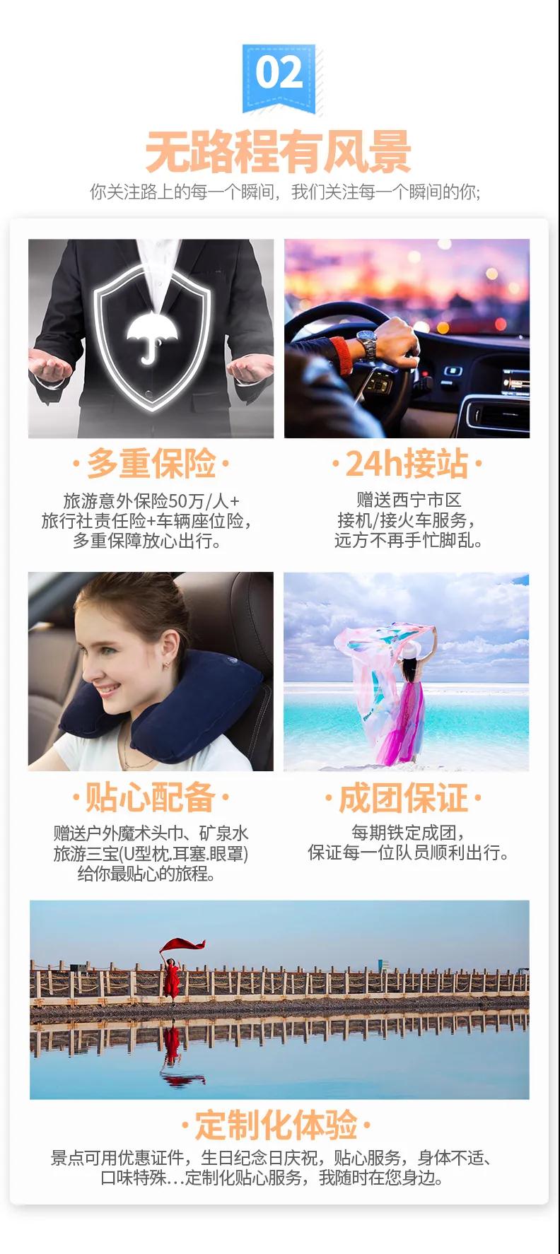 5、贈(zèng)送:贈(zèng)送西寧市區(qū)24小時(shí)接機(jī)/接火車服務(wù);贈(zèng)送戶外魔術(shù)頭巾、旅游三寶(頸枕耳塞眼罩)、礦泉水。(贈(zèng)送項(xiàng)目不用費(fèi)用不退)