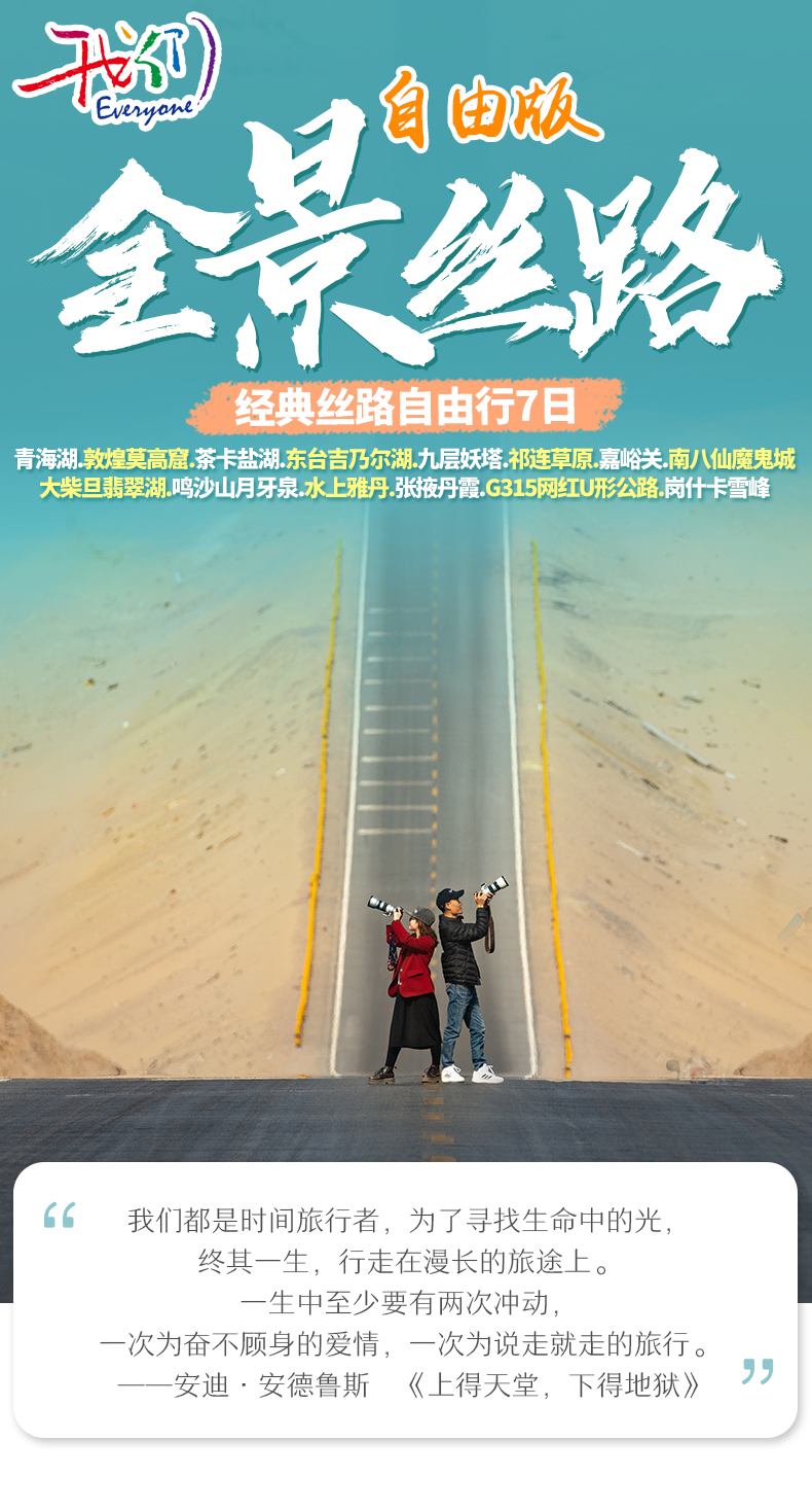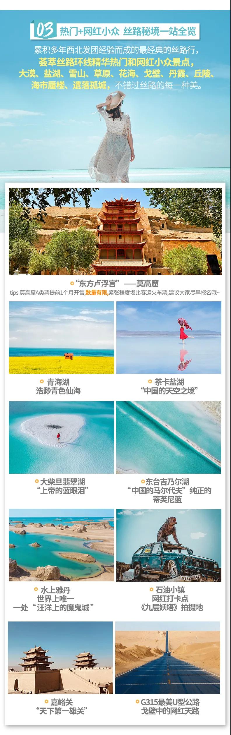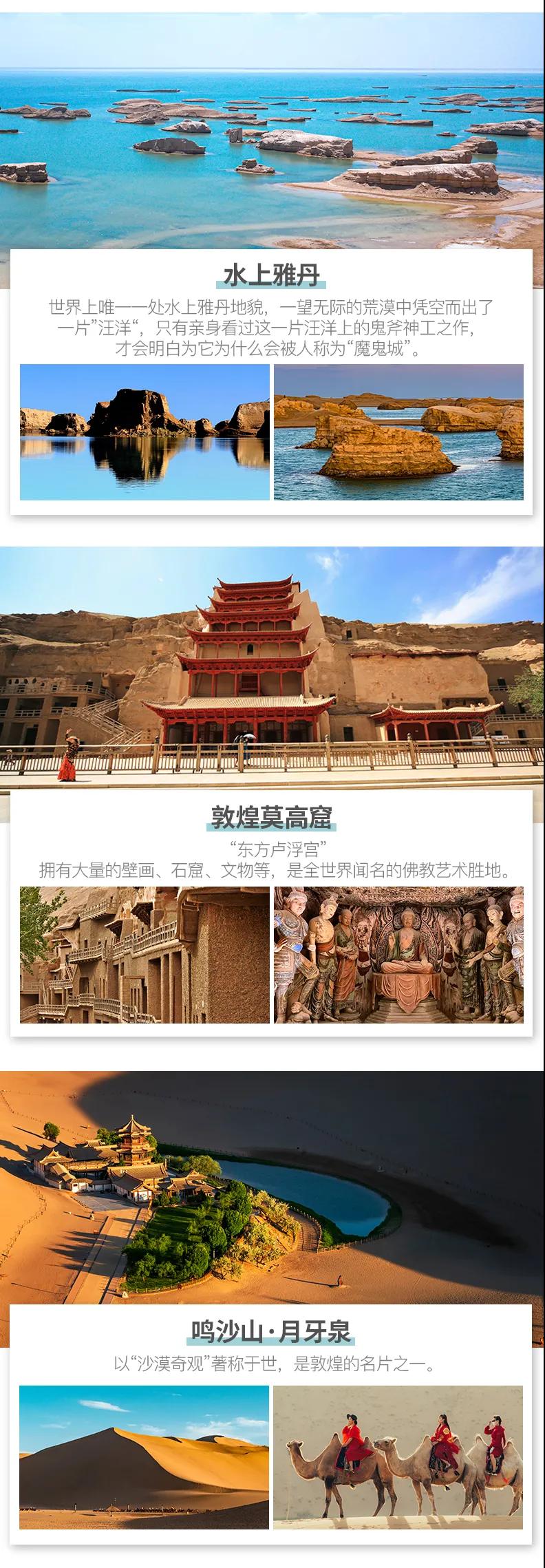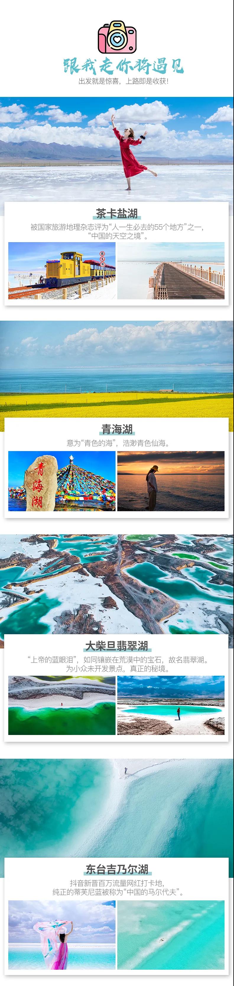 青海湖+敦煌莫高窟+茶卡鹽湖+東臺(tái)吉乃爾湖+九層妖塔+祁連草原+嘉峪關(guān)+南八仙魔鬼城+大柴旦翡翠湖+鳴沙山月牙泉+水上雅丹+張掖丹霞+G315U形公路+崗什卡雪峰