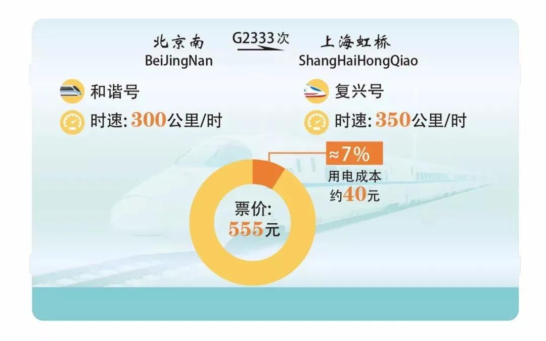 我們來看個實例。以京滬高鐵為例,據新華社報道,和諧號動車組時速300公里時,人均百公里耗電量為3.64度、單趟全程總耗電量約48度。據《科技日報》報道,時速350公里運行的復興號動車組人均百公里能耗僅3.8度電,單趟全程總耗電量約50度。按照目前高鐵享受的優(yōu)惠電價算,用電成本約40元,為京滬高鐵全程二等座票價555元的7%左右。