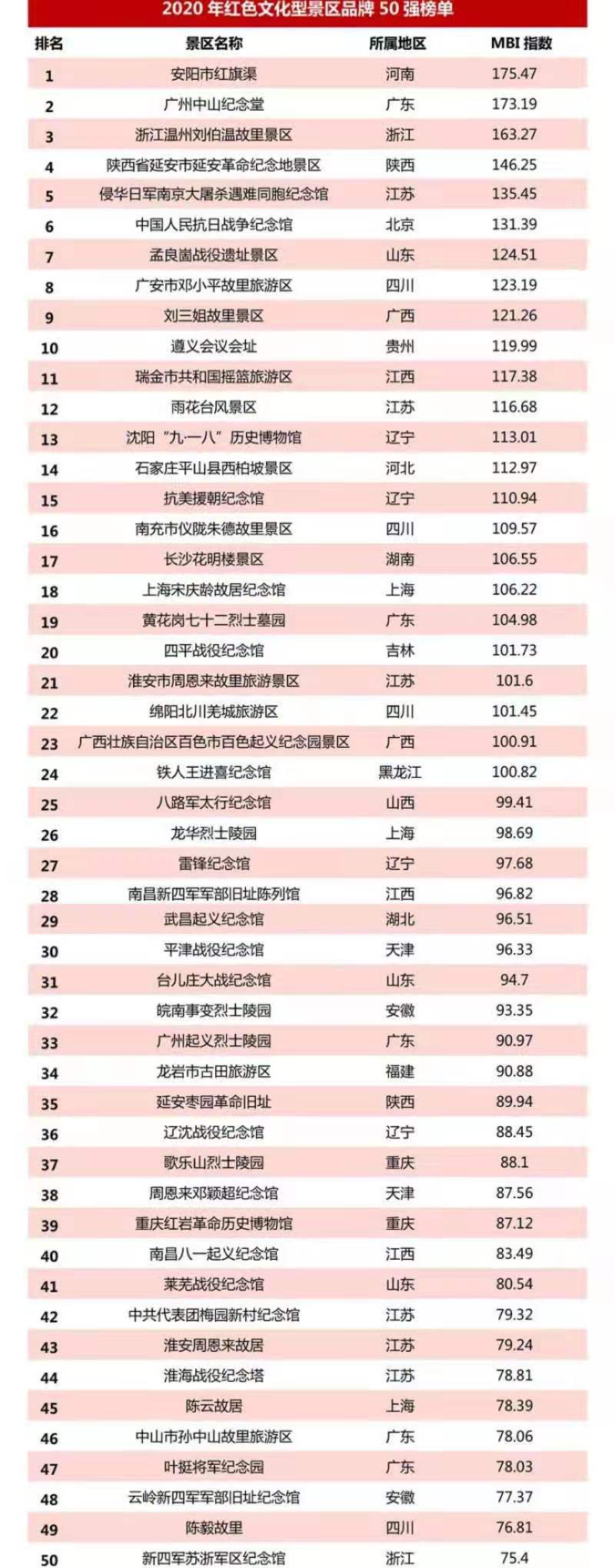以下是「我們」獨(dú)家發(fā)布的“2020年紅色文化型景區(qū)品牌50強(qiáng)榜單”,其中安陽市紅旗渠、廣州中山紀(jì)念堂、浙江溫州劉伯溫故里景區(qū)位列年度三甲。