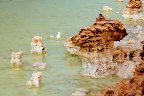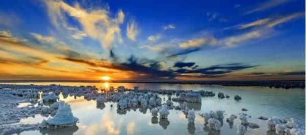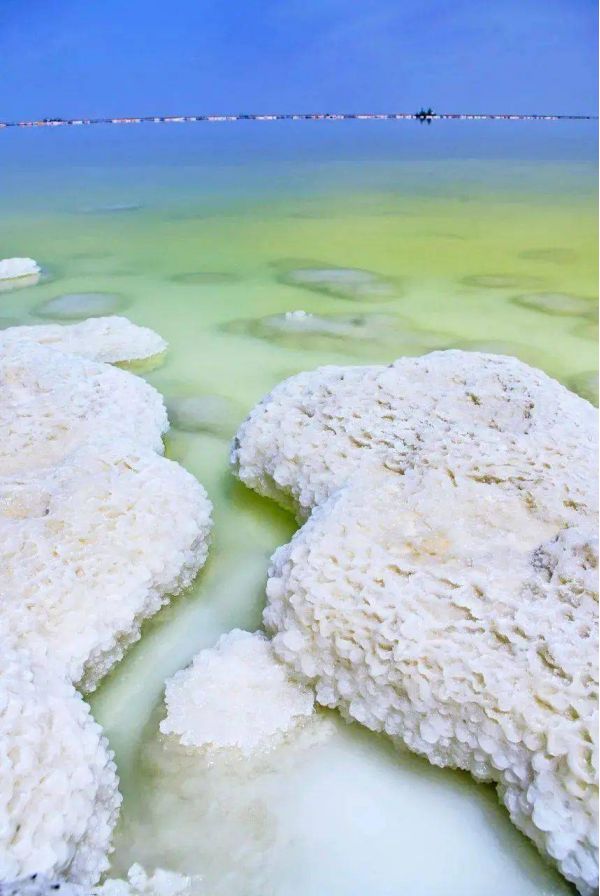 因為氣候炎熱干燥,湖水的蒸發(fā)量遠遠高于降水量,湖內(nèi)便形成了高濃度的鹵水,然后逐漸結晶成了鹽粒。而鹽花是鹽湖中的鹽結晶形成的特殊形狀的結晶體,由于結晶時的溫度,氣候,時間長短,濃度不同等原因,形成了各式各樣,萬千變化的美麗鹽花。生命的禁區(qū),萬物俱寂,但是唯有“鹽花”開的最旺,它就是大自然賜給人類的絕妙作品,日夜看守這片凈土。這些鹽花無需人工的雕琢,形態(tài)各異,有的宛如貝殼,有的宛如樓臺,一叢叢,一片片,一簇簇地立于鹽湖中,把鹽湖裝飾得如仙境一般。
