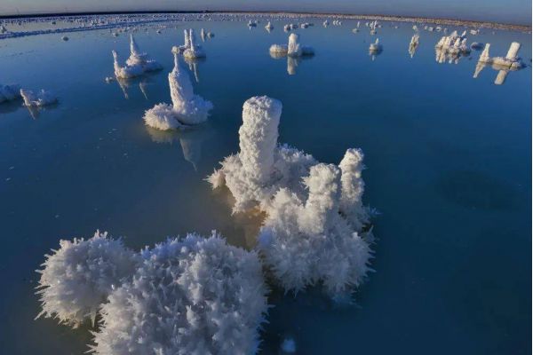 鹵水在結晶過程中因濃度不同、時間長短不一、成分差異等原因,形 成了形態(tài)各異、鬼斧神工一般的鹽花。 這里的鹽花或形如珍珠、 珊瑚,或狀若亭臺樓閣,或像飛禽走獸,一叢叢、一片片、一 簇簇地立于鹽湖中,把鹽湖裝點得美若仙境。