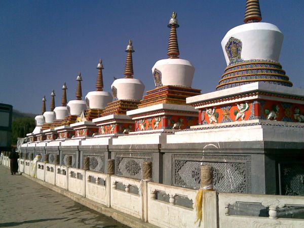 大拉浪由經(jīng)堂、華門、牌坊3座殿堂組成,為漢藏合璧式建筑,是塔爾寺總法臺的居住處,達賴、班禪曾駐蹕于此。居巴扎倉(密宗學院)系藏式平頂建筑。曼巴扎倉、丁科扎倉屬漢藏結合建筑。寶塔數(shù)十座,其中并列于寺前的8座如意寶塔,方座,瓶形塔身,尖頂,根據(jù)釋迦牟尼一生重要經(jīng)歷和傳說建成。 最后終于有了塔爾寺。