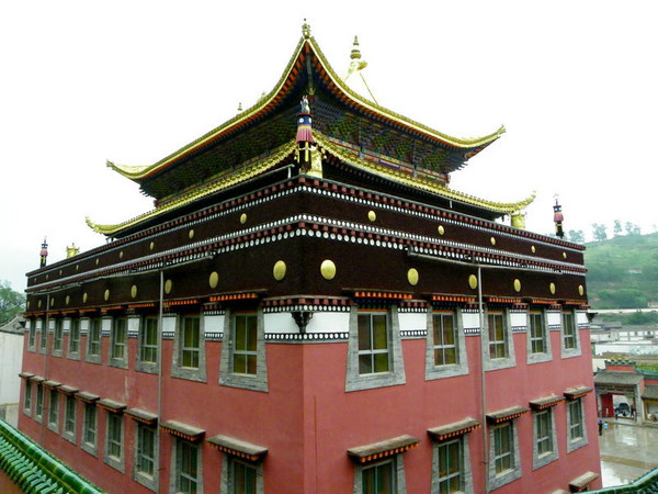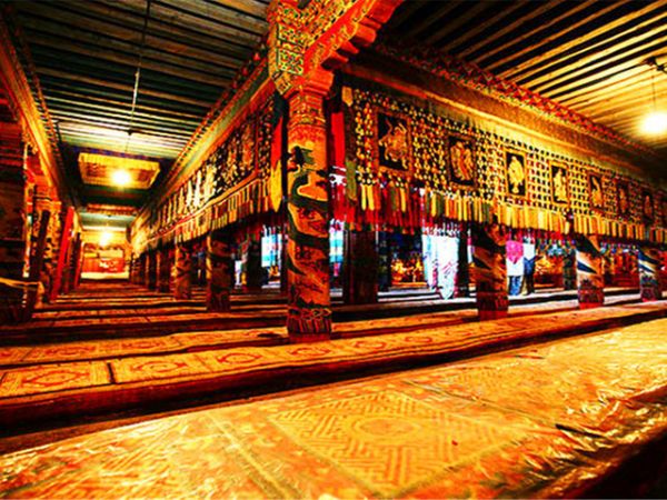 大經(jīng)堂始建于明萬歷三十四年(1606),毀于火,1917年重建。土木結構,為藏式雙層平頂建筑,漢式樓閣遙相互映。經(jīng)堂面闊十三間,進深十一間。面積1981平方米。堂內四壁存放著數(shù)百冊經(jīng)卷。