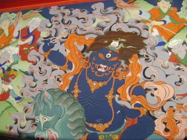 壁畫,是各個殿宇墻壁上繪畫,它大多繪于布幔上,也有的直接繪于墻壁和棟梁上。壁畫的染料采用天然石質礦物,因此具有色澤鮮艷,經(jīng)久不變的特點。塔爾寺的壁畫屬喇嘛教畫派,因此具有濃厚的印、藏風味。壁畫內容,人物主次多屬密乘教義,畫面構想巧妙,布署適然,色調和諧,工藝精湛,手法細膩。