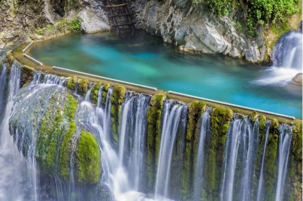 螺髻山九十九里溫泉不僅是世界第一大溫泉瀑布,還是世界唯一的掛壁溫泉、世界唯一的溫泉群島,由數(shù)十個大小不一的溫泉瀑布組合而成的一個寬達(dá)200余米的溫泉瀑布群。首先映入眼簾的是一泓清澈見底的大槽河,河流纏繞在青山綠水間,漫步在奔騰而下的大槽河畔,陣陣涼風(fēng)夾雜著水霧撲面而來,郁郁蔥蔥的山嶺上百瀑飛瀉,雄奇的靈崖異石,成群的瀑布形態(tài)各異;順著河流而上,聲響如雷,一簾高31米寬19米掛在懸崖峭壁之上的溫泉瀑布呈現(xiàn)在了眼前,銀簾空懸而掛,蒸騰彌漫、熱霧繚繞;崖壁上的天然小水池,被稱之為“鴛鴦池”,沐浴其間,聽滴水彈琴,享靈崖泉韻,觀簾外景物,撲塑迷離,恍若大虛幻景。