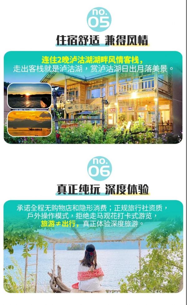 贈(zèng)送:贈(zèng)送西昌地道自助火盆燒烤;贈(zèng)送摩梭篝火晚會(huì);匠心贈(zèng)送價(jià)值98元的瀘沽湖走婚橋旅拍,每人一張旅拍大片+底片全送+額外再贈(zèng)水晶相框;贈(zèng)送旅行三寶(耳塞眼罩和頸枕),緩解旅途疲勞;2人及以上贈(zèng)送成都24h接機(jī)接站服務(wù)。贈(zèng)送項(xiàng)目不用費(fèi)用不退;