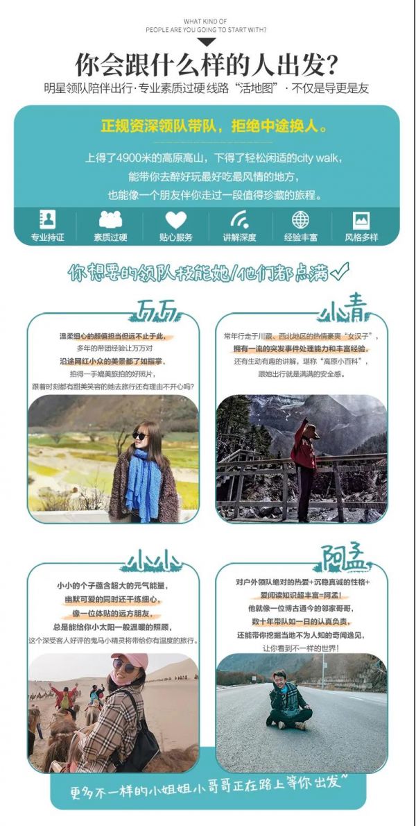 私人訂制:我們業(yè)務(wù)范圍囊括了全國(guó)各大城市,川西、西北、東北,在路上永遠(yuǎn)有我們的身影。我們將為每一個(gè)有定制需求的你策劃出獨(dú)屬于自己的完美旅行。