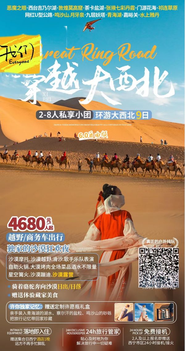 如果讓我們推薦一條去- -次抵十次的旅行路線,那一定是西北大環(huán)線!沙漠、戈壁、雪山、草原、花海、湖泊、石窟、雅丹、丹霞...這些看似無法兼容的美景,全部都真實匯聚在這條線路.上!,我們深耕大西北多年,不斷打磨迭代升級推出西北大環(huán)線6.0版本,保留最經(jīng)典的風景,解鎖小眾高顏值景點給你最難忘的大西北旅行。