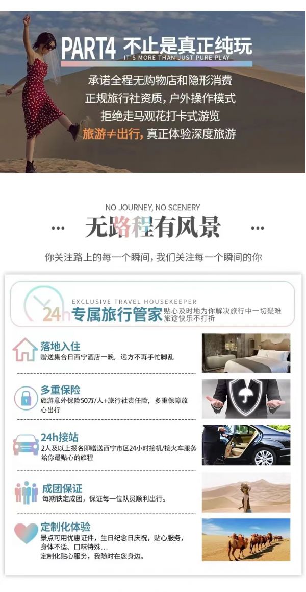 請對應(yīng)使用我方穿越大西北2-8人VIP私享小團9日行程,因使用其它行程造成的投訴,責任自負;請仔細閱讀以上行程文檔,同意并保證遵守我方安排,以免為您帶來不必要的麻煩;如產(chǎn)生合同糾紛或人身意外事故,按《中華人民共和國合同法》、《道路交通法》、《保險賠償條例》裁定;本行程作為旅游合同附頁與旅游合同同等法律效力。