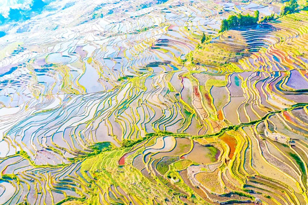 紅河哈尼梯田位于紅河南岸哀牢山余脈,遍布元陽、紅河、金平、綠春四縣,總面積約100多萬畝。