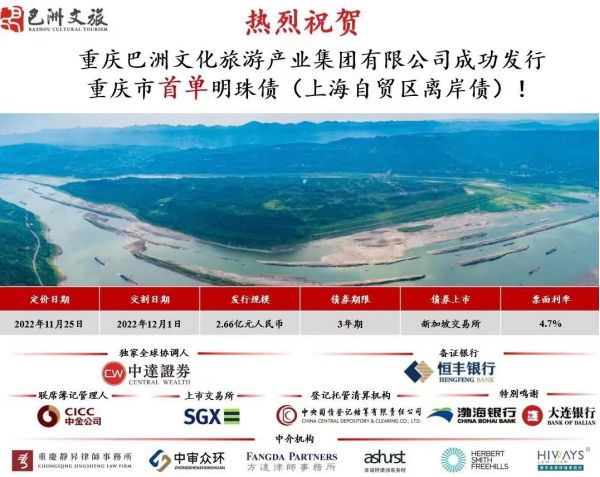 近日,由靜昇律師事務(wù)所提供法律服務(wù)的重慶巴洲文化旅游產(chǎn)業(yè)集團有限公司2022年度上海自貿(mào)區(qū)離岸債券成功發(fā)行。本次上海自貿(mào)區(qū)離岸債券發(fā)行規(guī)模為人民幣2.66億元,發(fā)行期限為3年,票面利率4.7%,由恒豐銀行擔(dān)任備證行,由中達證券主承銷。本次發(fā)行的上海自貿(mào)區(qū)離岸債券是該種類債券在重慶市的首次發(fā)行,具有里程碑式意義。