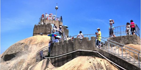 日光巖是由兩塊巨石一豎一橫相倚而立,成為龍頭山的頂峰?!伴}海雄風(fēng)”附近,還有清代著名書法家何紹基題刻“腳力盡時山更好”七個大字,筆法俊逸瀟灑,自成一格,意在鼓勵游人奮力攀登,更上一層樓,風(fēng)光在頂峰。