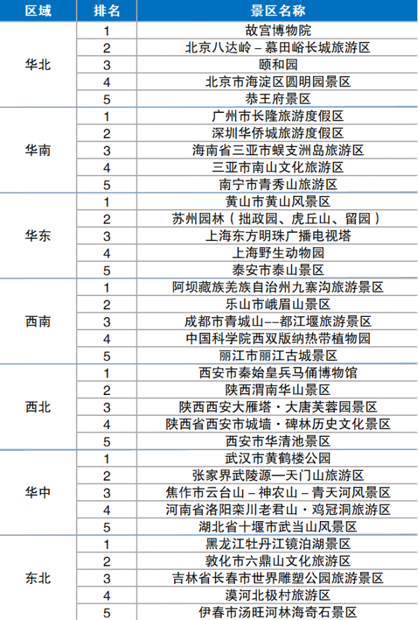 分地區(qū)來看,東北地區(qū)綜合影響力排行榜首為牡丹江鏡泊湖景區(qū);華北地區(qū)的榜首為故宮博物院;華東地區(qū)以黃山風(fēng)景區(qū)為第一位;華南地區(qū)的榜首為長隆旅游度假區(qū);華中地區(qū)的榜首為黃鶴樓公園;西北地區(qū)的秦始皇兵馬俑博物館最有影響力;西南地區(qū)的九寨溝旅游景區(qū)位居榜首。