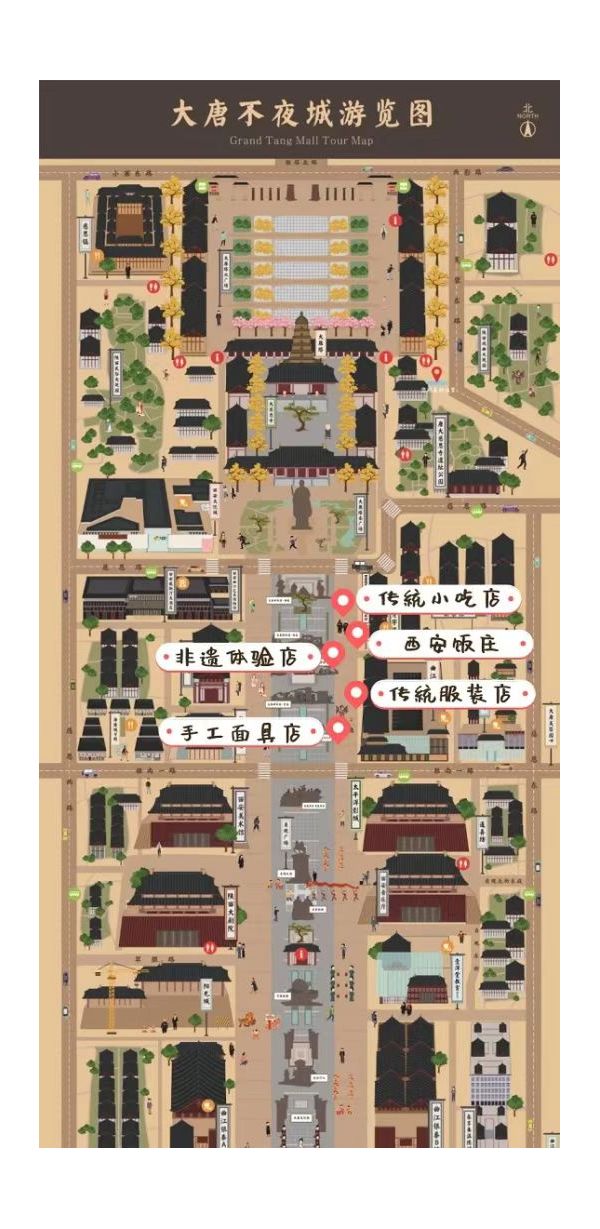 大唐不夜城整體布局為線性布局,以大雁塔南廣場到古城墻遺址之間的連線為軸線,由北向南分別為商業(yè)步行街、貞觀廣場、文化交流廣場、慶典廣場、古城墻遺址公園五個(gè)景觀區(qū)域。