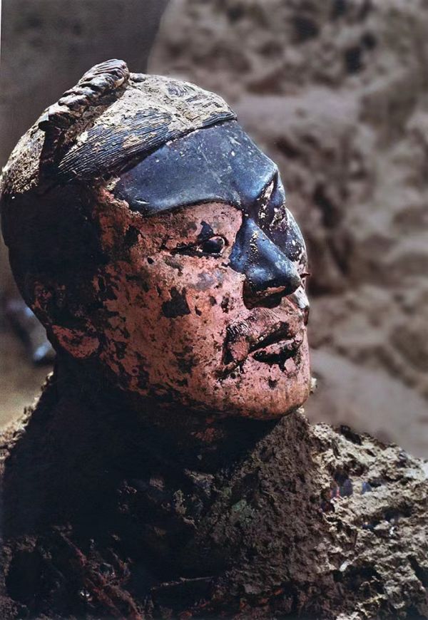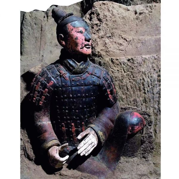當初的兵馬俑都有鮮艷和諧的彩繪,發(fā)掘過程中發(fā)現(xiàn)有的陶俑剛出土時局部還保留著鮮艷的顏色,但是出土后由于被氧氣氧化,顏色不到十秒鐘瞬間消盡,化作白灰?,F(xiàn)在能看到的只是殘留的彩繪痕跡。