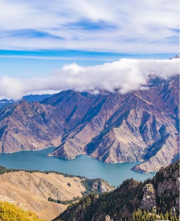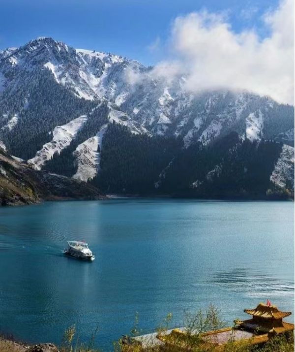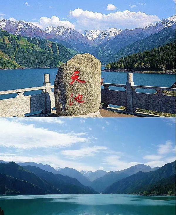 天山博格達(dá)峰海撥5445米,終年積雪,冰川延綿。天山天池是古冰川泥石流堵塞河道形成的高山堰塞湖,形狀因原來為河谷而顯得曲折幽深。