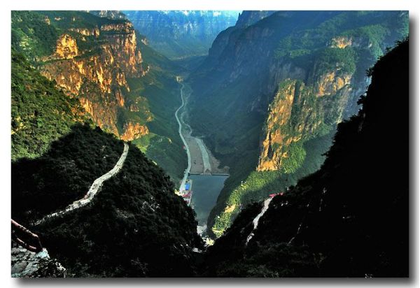 東出河南林州,至合澗,經(jīng)弓上水庫(kù),進(jìn)太行山大峽谷,入大河關(guān),上行至(西從太行山大峽谷入口處——山西壺關(guān)下石坡,沿蔭林公路,穿越王莽峽、土圪堆、日月隧道、紅豆峽口,下行至)古鎮(zhèn)橋上村,即到八泉峽風(fēng)景區(qū)入口。