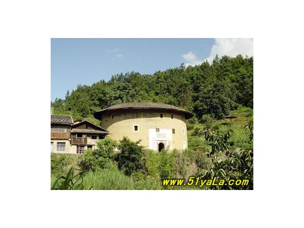 永定土樓分方形土樓和圓形土樓。永定全縣有圓樓360座,方樓4000余座。圓形土樓(又稱圓寨)是客家民居的典范,圓樓大都由二、三圈組成, 由內(nèi)到外,環(huán)環(huán)相套。外圈高十余米,一般高三至四層,有一、二百個房間。一層是廚房和餐房,二層是倉庫,三、四層是臥室;二圈兩層,有三十至五十個房間,一般是客房。中間是祖堂,是居住在樓里幾百人婚喪喜慶的公共場所。樓內(nèi)還有水井、浴室、磨房等設(shè)施。土樓采用當?shù)厣梁恢?,不需絲毫鋼筋水泥,墻的基礎(chǔ)寬達三米,可行汽車,底層墻厚1.5米可橫臥人,向上依次縮小,頂層墻厚也不小于0.9米。沿圓形墻用木板分割成眾多的房間,其內(nèi)側(cè)為走廊。