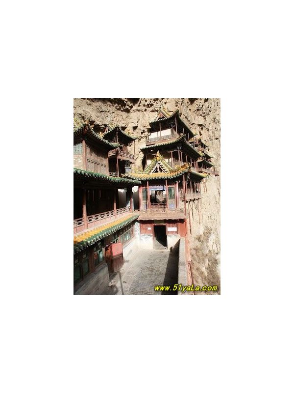 北岳恒山風(fēng)景區(qū)內(nèi)的另一處重要景觀是懸空寺。懸空寺位于北岳恒山腳下、渾源縣城南5公里處的金龍峽內(nèi)西巖峭壁上。寺創(chuàng)建于北魏后期(約為公元471—523年),現(xiàn)存建筑分明清兩代修建后的遺物。懸空寺靠西面東,儼若精巧、別致、玲瓏剔透的玉雕懸于一幅巨大的屏風(fēng)上。寺內(nèi)共有殿宇樓閣40間。南北,有三檐歇山頂危樓聳起,對(duì)峙而立,由低向高三層疊起,離地百余尺,附于絕壁上,三面環(huán)廊國(guó)抱、六座殿閣,相互交叉,飛架棧道相連,高低錯(cuò)落,木制樓梯溝通,遷回曲折,構(gòu)思布局妙不可言、整個(gè)寺面似虛而實(shí),似危而安,實(shí)中生巧,危里見(jiàn)俏,一種在國(guó)內(nèi)其它寺廟中體會(huì)不到的奇險(xiǎn)感緊緊地抓住游人的好奇心理。懸空寺內(nèi)塑像頗多,有銅鑄、鐵鑄、泥塑、石雕像共78尊。三圣殿內(nèi)的泥塑,具有唐、明兩代風(fēng)韻,釋迎、韋馱、天女、阿難形體豐滿,神彩動(dòng)人,仙女婀娜、韋馱英武、阿難虔誠(chéng),各具風(fēng)彩。三教殿內(nèi),釋迦牟尼、老子、孔子三教臺(tái)流,共居一室,耐人尋味、始祖同堂,堪稱中國(guó)宗教史上的一段佳話。懸空寺內(nèi),有朝殿、會(huì)仙府、碧霞宮、純陽(yáng)宮、樓臺(tái)亭、寢宮、梳妝樓、御碑亭等。