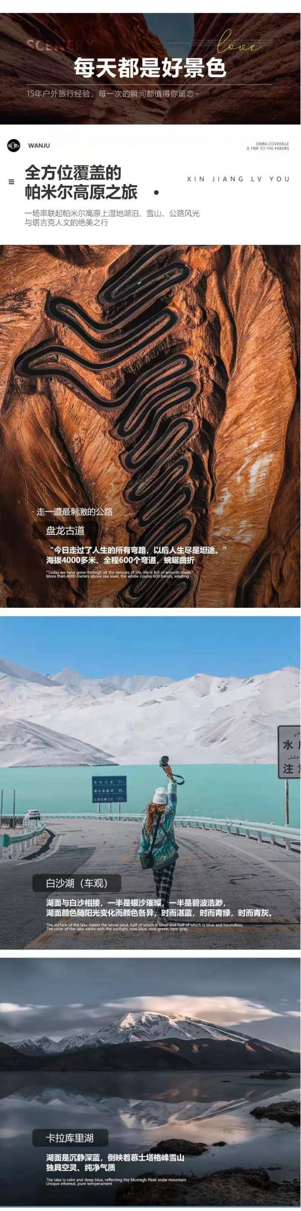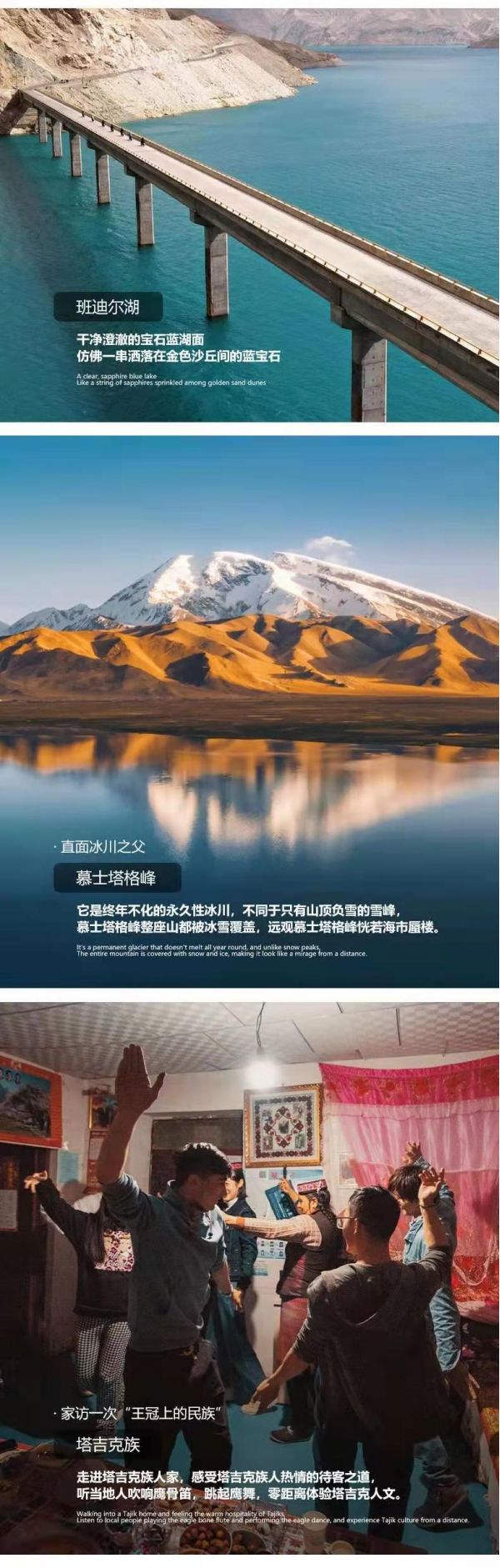 告別“東方摩洛哥”—喀什,我們將開啟一段帕米爾高原之旅。沿314國道一路暢游帕米爾高原風(fēng)光,首先驚艷我們的是背靠白色沙丘和雪山的【白沙湖】,在陽光的變化下,湖水時(shí)而呈湛藍(lán)色,時(shí)而呈綠色。更令人驚嘆的是,藍(lán)色的湖面與白沙相接,一半藍(lán)一半白,而白沙背后還有雪山。在雪山和白沙的映襯之下,白沙湖水更顯澄澈。在這里能get湖泊、白沙、雪山同框的畫面。分享一個(gè)冷知識:白沙湖又名流沙河,就是西游記里唐僧收服沙和尚的地方。我們還能途觀慕士塔格峰,山頂常年皚皚白雪,猶如滿頭白發(fā),十余條冰川鑲嵌在峰體下的峽谷中,如胸前飄動(dòng)的銀須,故有“冰山之父”的美稱。隨后我們將遇見【卡拉庫里湖】,這里能看到雪山倒映在湖面的風(fēng)景,拍出來的照片特別的給人純凈的感覺。