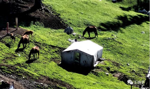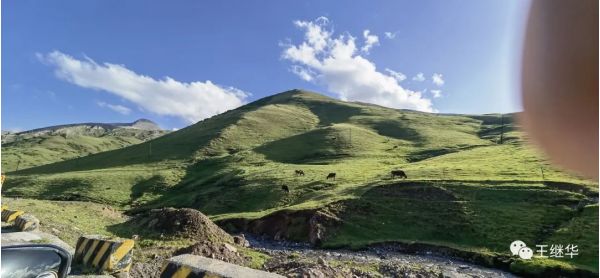 和前天的丹霞地貌的顏色截然相反,昨天給大家情緒是孤獨,荒漠和驚奇。今天滿目蒼翠起伏的山巒和連綿不斷大草原給人的是溫馨,扎實,平靜和生命的萌動。厚實的草甸子上每一棵小草都頂著一顆晶瑩剔透的露珠感染力極強。你的愛意不自覺的從眼神里益處。