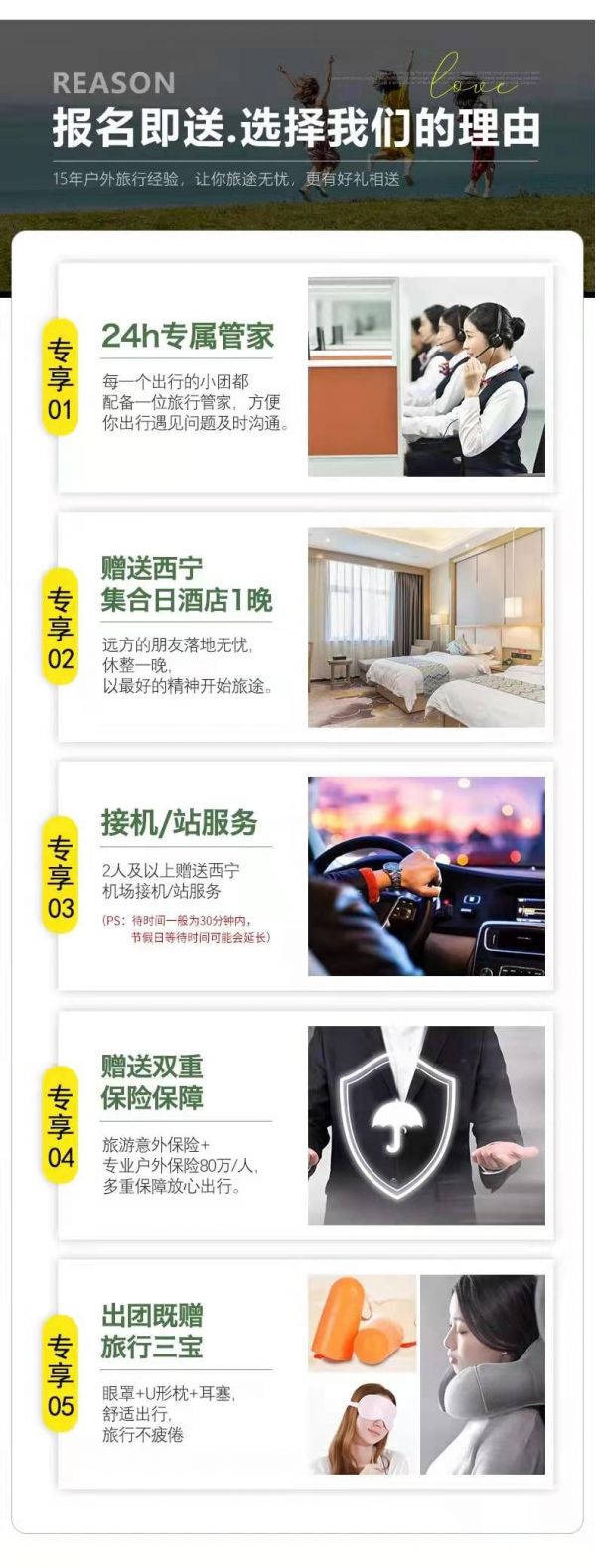 本次活動(dòng)提供西寧市內(nèi)24小時(shí)接機(jī)/接站服務(wù),工作人員會(huì)在您出發(fā)日期前一天21:30之前向您推送消息并與您聯(lián)系,如果超過(guò)時(shí)間沒(méi)有接到任何通知,請(qǐng)及時(shí)與報(bào)名處聯(lián)系。(接站等待時(shí)間一般為15-20分鐘,最長(zhǎng)不超30分鐘,節(jié)假日拼單人數(shù)較多情況下客人等待時(shí)間可能會(huì)延長(zhǎng))。