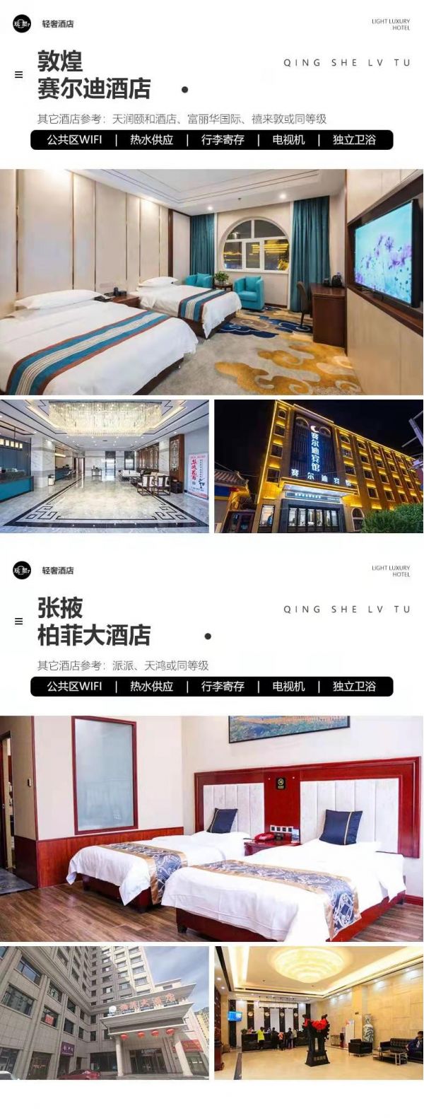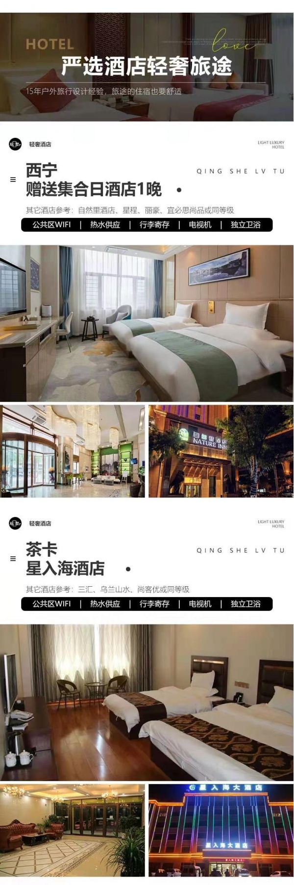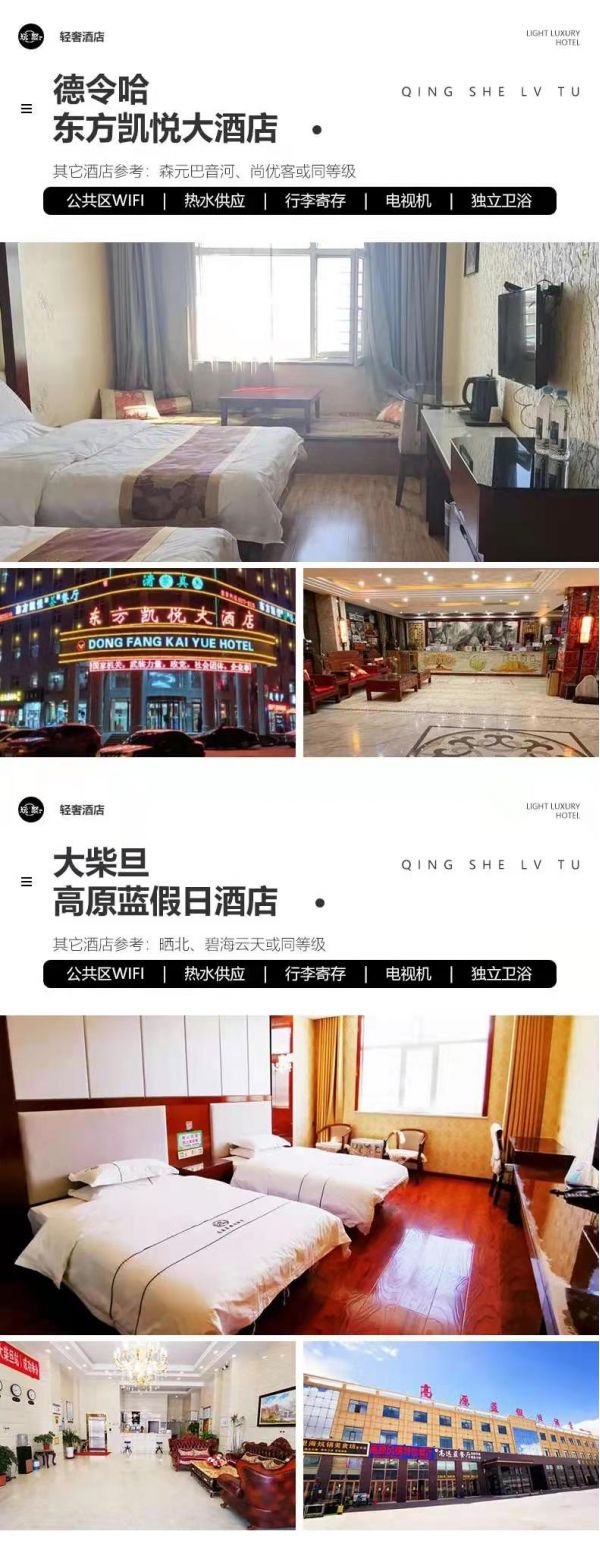 住宿:行程所列6晚住宿。我們會(huì)提供行程內(nèi)展示照片的酒店或其他條件相似酒店,但因沿途條件有限,如酒店設(shè)施達(dá)不到您的期望,請(qǐng)您諒解。西寧:自然里酒店、星程、麗豪、宜必思尚品或其它同級(jí)酒店德令哈:柏菲大酒店、派派、天鴻或其它同級(jí)酒店大柴旦:高原藍(lán)假日酒店、曬北、碧海云天或其它同級(jí)酒店茶卡:星入海、三匯、烏蘭山水、尚客優(yōu)或其它同級(jí)酒店敦煌:賽爾迪酒店、天潤(rùn)頤和酒店、富麗華國(guó)際、禧來(lái)敦或其它同級(jí)酒店張掖:柏菲大酒店、派派、天鴻或其它同級(jí)酒店服務(wù):由經(jīng)驗(yàn)豐富的司機(jī)提供向?qū)Х?wù),司機(jī)非導(dǎo)游,不進(jìn)景區(qū),敬請(qǐng)諒解。