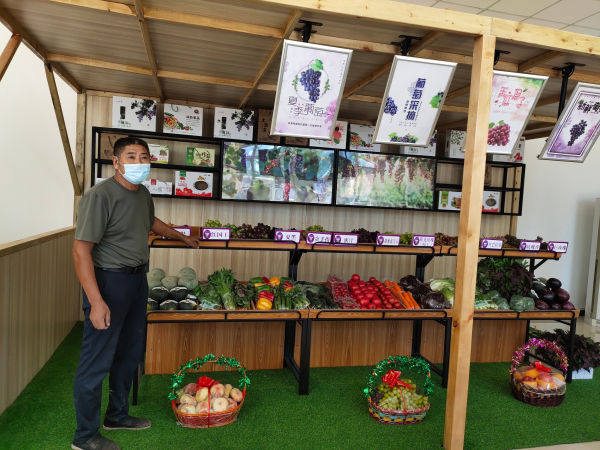 活動(dòng)現(xiàn)場(chǎng)分為鎮(zhèn)域特色產(chǎn)品展賣(mài)區(qū)和打卡拍照點(diǎn)位兩個(gè)功能區(qū)。在展賣(mài)區(qū),用茅草、榆木等元素搭建的仿古攤位錯(cuò)落有致,葡萄、番薯、黃瓜等農(nóng)產(chǎn)品整齊擺放,展銷(xiāo)員化身古代“店小二”,吆喝售賣(mài),熱鬧非凡。在拍照點(diǎn),一張榆木桌,兩把木長(zhǎng)椅,以及棉麻老粗布古旗、蓑衣斗笠、茶盞等老物件元素,高度還原了古代道旁的茅草茶棚。游客紛紛帶著在展賣(mài)區(qū)消費(fèi)獲得的“銅錢(qián)”,到此換裝拍照、打卡留念。“這是香緹,是巨峰葡萄和玫瑰香葡萄雜交的品種,香味濃,吃起來(lái)不澀;這是金手指,含糖量高,非常甜,女士和小朋友比較喜歡;這是陽(yáng)光玫瑰,又叫晴王葡萄,是今年的網(wǎng)紅葡萄……”活動(dòng)現(xiàn)場(chǎng),北京采育喜山葡萄生態(tài)采摘園負(fù)責(zé)人杜喜山指著攤位上的一串串葡萄娓娓道來(lái),向游客講述自己和家鄉(xiāng)的“葡萄故事”。