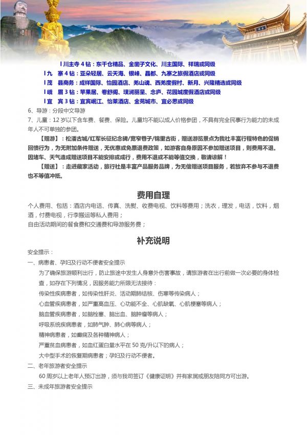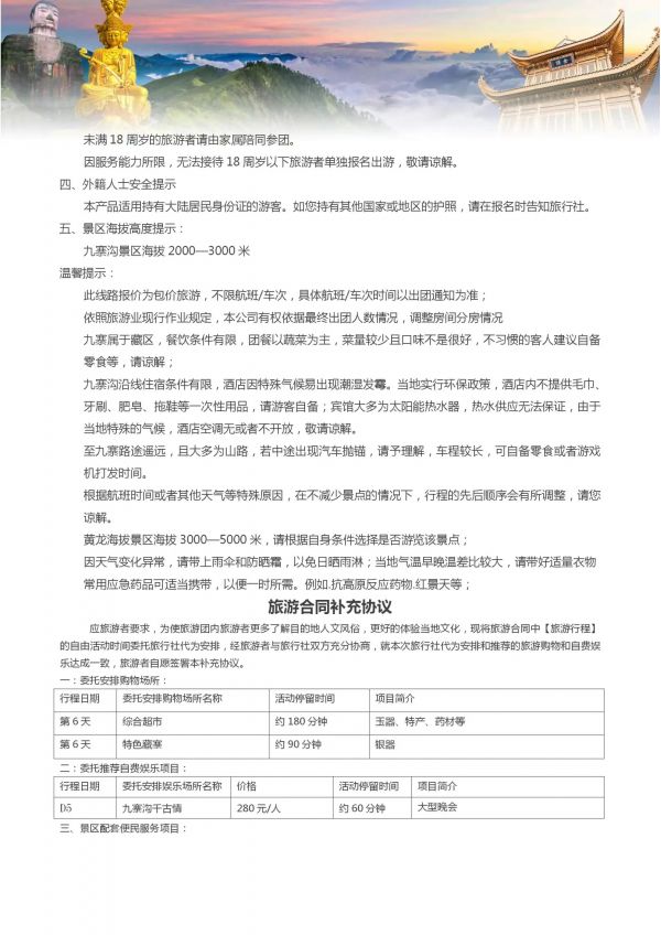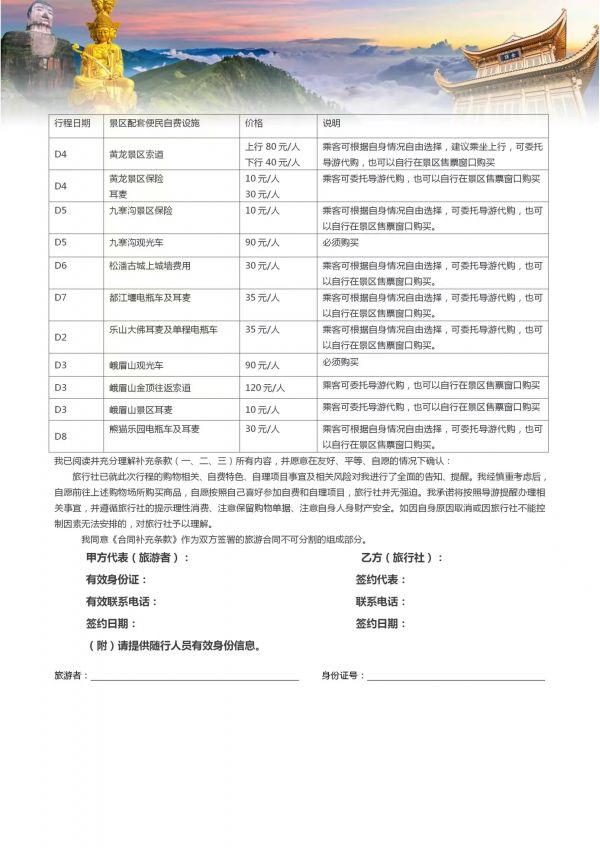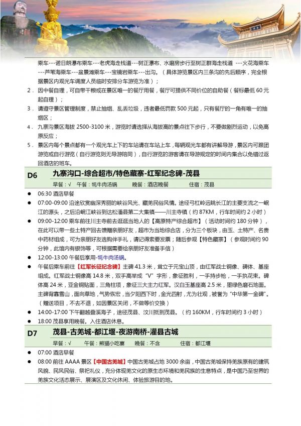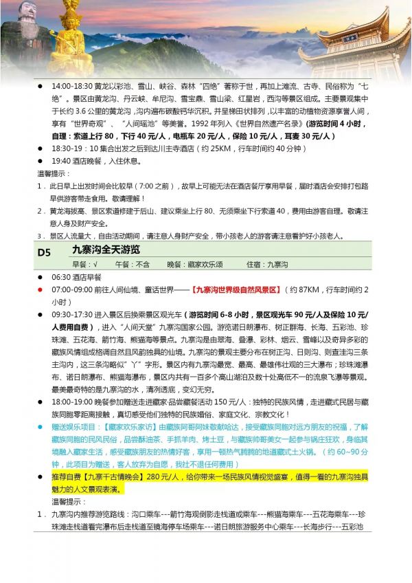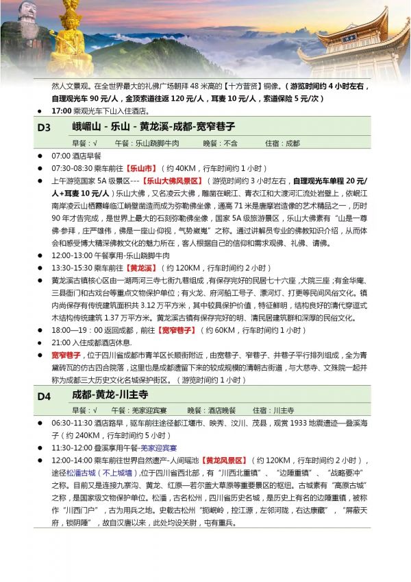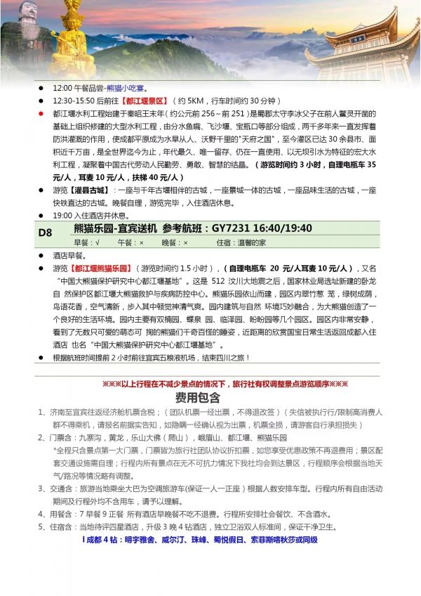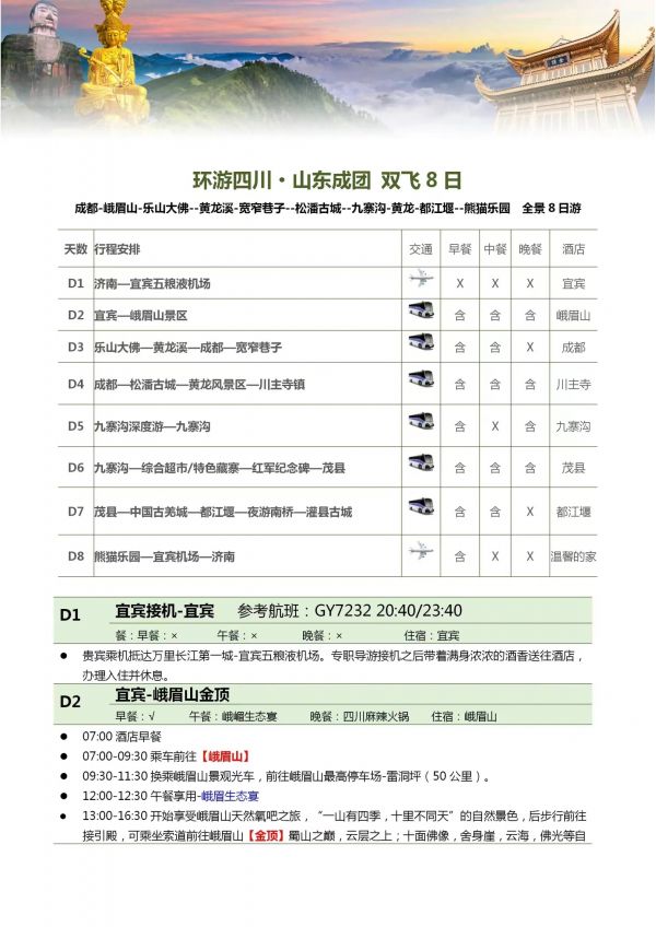 四川雙飛8日游 聊城出發(fā) 純玩 無購物 成都 黃龍溪 樂山 峨嵋山 九寨 黃龍 都江堰 熊貓樂園 ...... 發(fā)團日期 20230612 20230619 20230703 價格 3380 3580 報名電話 0635 8681234