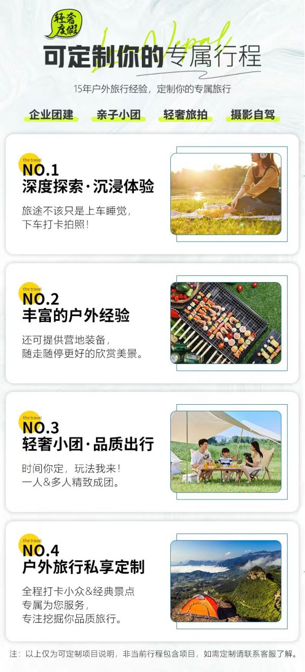 私人訂制:我們業(yè)務(wù)范圍囊括了全國各大城市,川西、西北、西藏、新疆,在路上永遠有我們的身影。我們將為每一個有定制需求的你策劃出獨屬于自己的完美旅行。