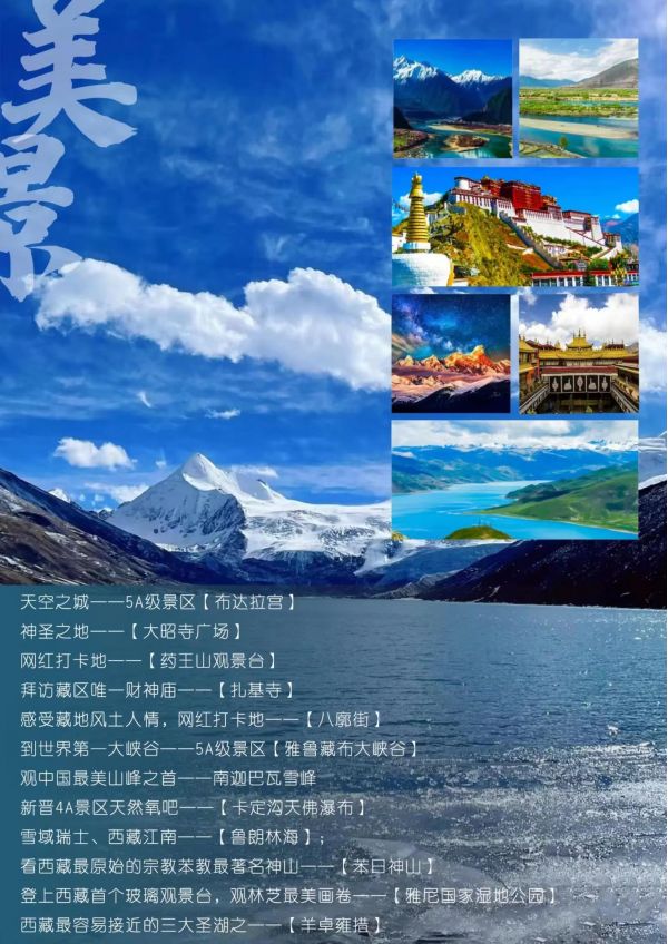 青藏9日游 聊城發(fā)團(tuán) 純玩 無購物 西寧 拉薩 布達(dá)拉宮 藥王山觀景臺 大昭寺廣場 八角街 卡定溝 雅魯藏布大峽谷 尼洋河景觀帶 南迦巴瓦雪峰 ...... 發(fā)團(tuán)日期 20230616 20230620 價格 4588 報名電話 0635 8681234