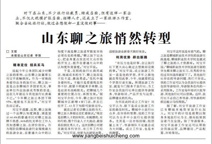 據(jù)了解,劉寶平旅游工作室已有聊城本地數(shù)家旅行社加入。劉寶平的計劃是前期以服務(wù)本地旅行社為主,繼而拓展到全省乃至全國。除了導(dǎo)游服務(wù),劉寶平旅游工作室還可以幫助會員搞運營、品牌建設(shè)、產(chǎn)品配置、市場策劃。