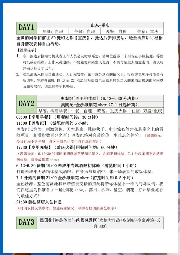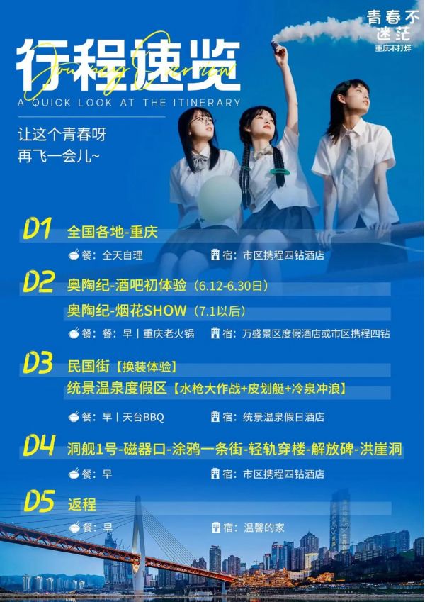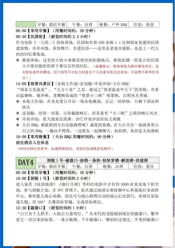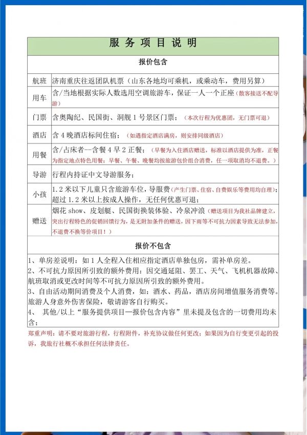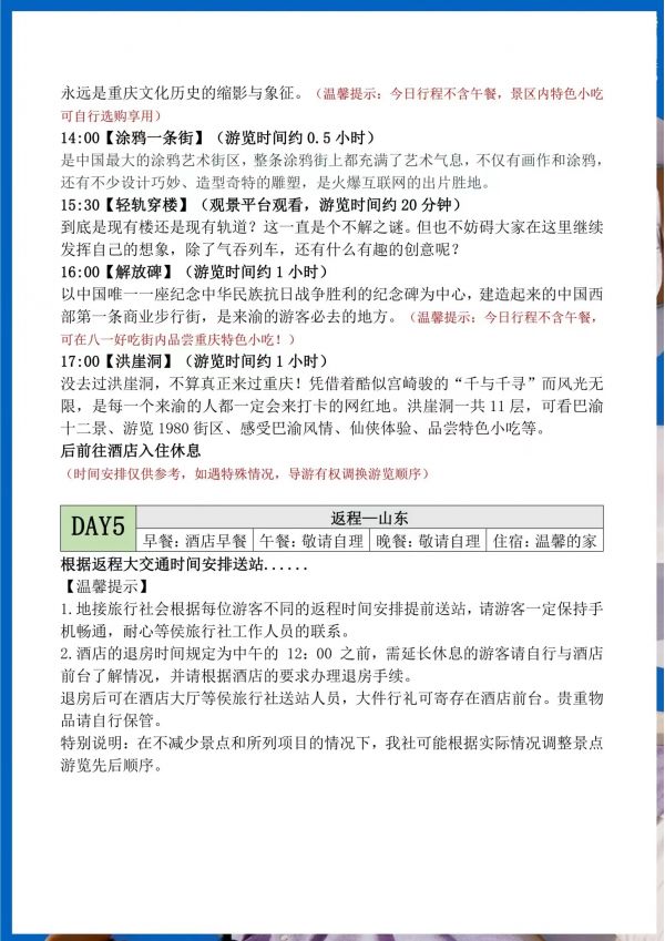 重慶雙飛5日游 聊城發(fā)團(tuán) 純玩 無購物 重慶奧陶紀(jì)題公園 統(tǒng)景風(fēng)景區(qū) 民國街 黃桷坪涂鴉街 中山四路 洪崖洞 磁器口 輕軌穿樓 ...... 發(fā)團(tuán)日期 2023061620230621 價格 3990 報名電話 0635 8681234