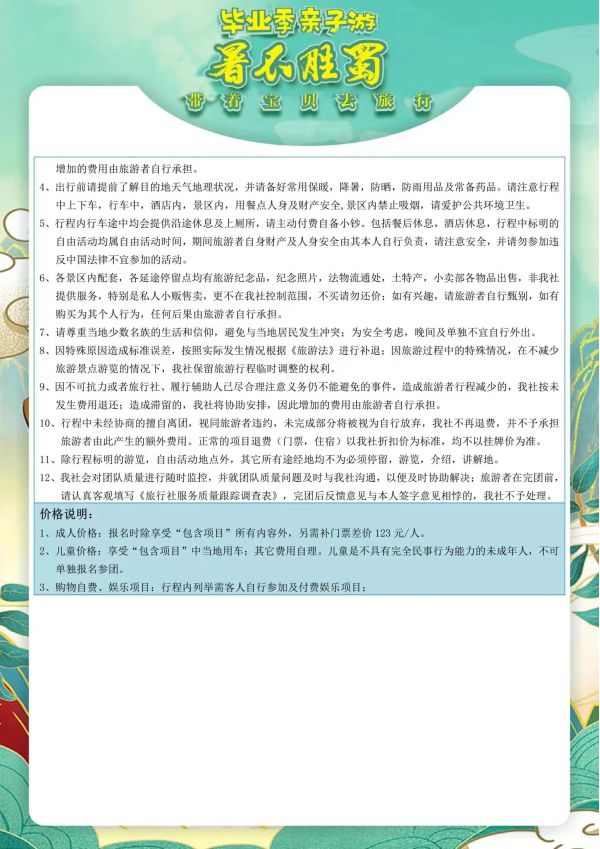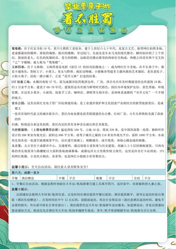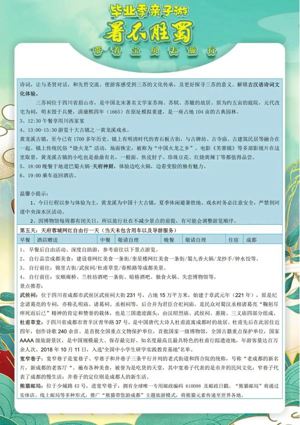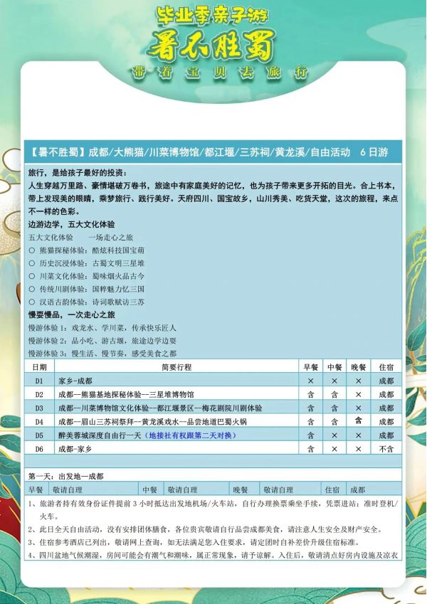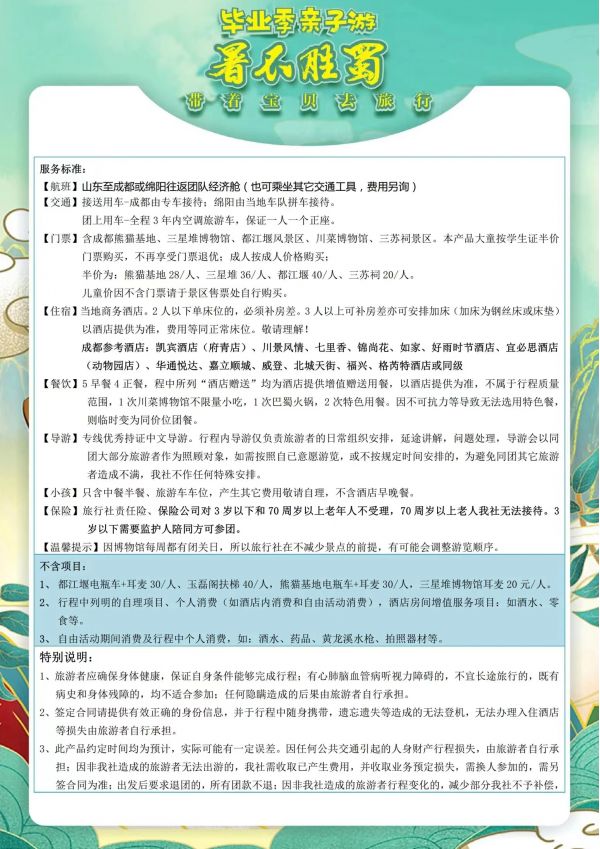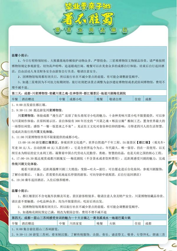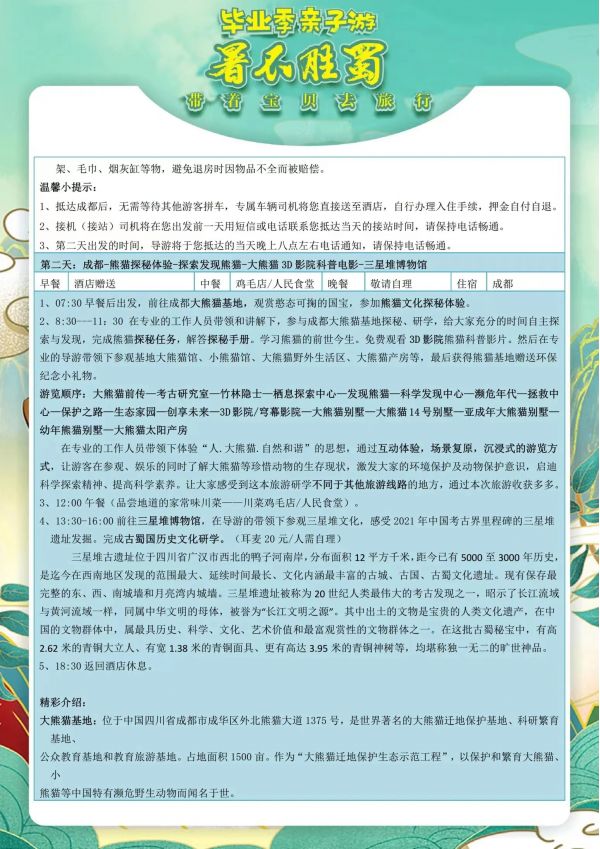 成都雙飛6日游 聊城發(fā)團(tuán) 純玩 無購物 成都 都江堰 熊貓基地 三星堆 三蘇祠黃龍溪 川菜博物館 川劇表演 自由活動 ...... 發(fā)團(tuán)時間 20230616 20230618 20230620 20230630 價格 3990 4290 報名電話 0635 8681234