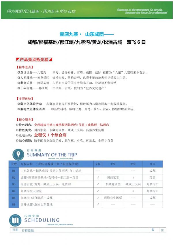 成都-九寨溝雙飛6日游 聊城發(fā)團(tuán) 純玩 無購物 成都 熊貓基地 都江堰 九寨溝 黃龍 松潘古城 ...... 價(jià)格 3190 3490 報(bào)名電話 0635 8681234