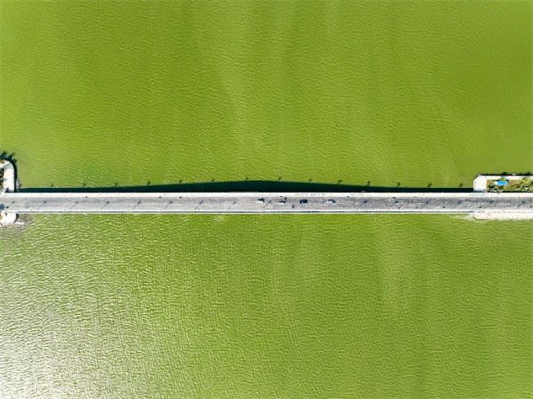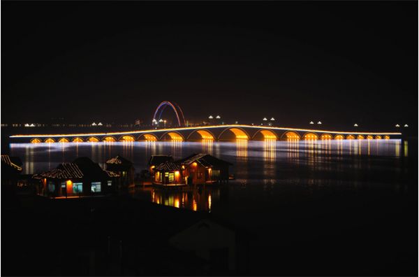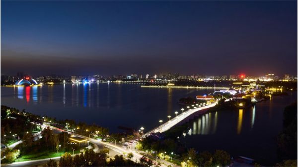 天光云影,碧波萬頃,不外如是。橋上是車水馬龍,車下便是萬家燈火。