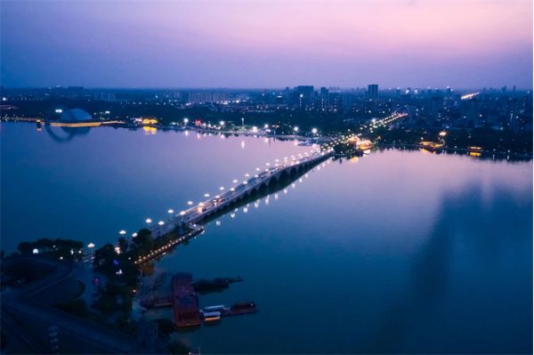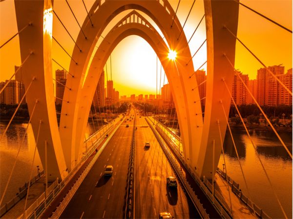 宏偉大氣的湖南路大橋,橋身兩岸有兩根對稱的主纜和37對吊索,猶如琴弦,車水馬龍的聲音就好像這座城市的交響樂曲,歌頌著城市的飛速建設(shè)與發(fā)展。