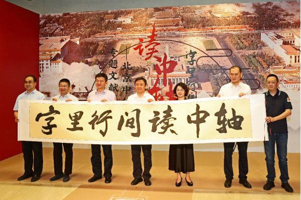 活動開幕儀式現(xiàn)場,北京市文物局副局長褚建好,北京市文化和旅游局副局長王洪濤,北京市東城區(qū)副區(qū)長唐立,展覽主辦單位以及北京京企中軸線保護(hù)公益基金會的嘉賓共同展開寫有“字里行間讀中軸”的卷軸,一場講述壯觀中軸、人文中軸、多彩中軸的展覽正式拉開序幕。