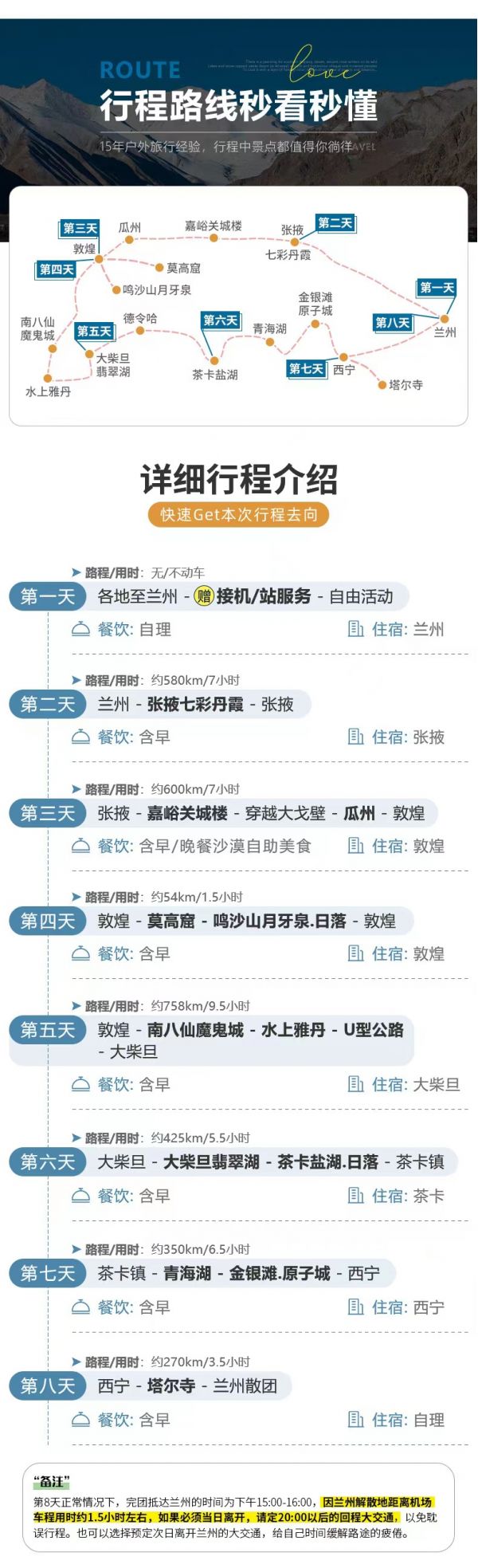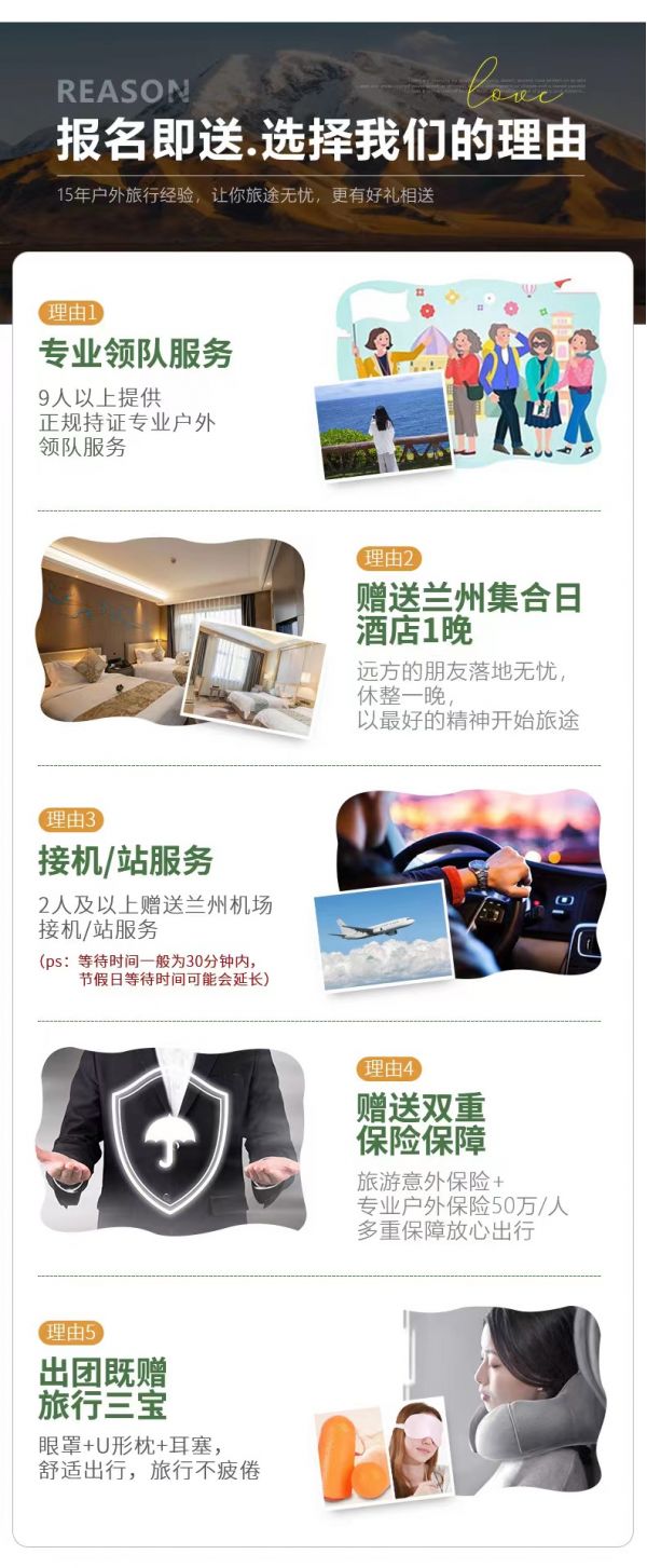 (5)贈送2人及以上蘭州市區(qū)接火車服務(wù);4人以上接機(jī)服務(wù),23點(diǎn)后由于運(yùn)管規(guī)定不能接機(jī)/接站,敬請諒解;服務(wù):9人及以上,提供持證正規(guī)導(dǎo)游服務(wù);8人及以下,由經(jīng)驗(yàn)豐富的司機(jī)帶隊,無單獨(dú)導(dǎo)游服務(wù),請諒解。保險:贈送高額旅游意外保險,旅游意外保險最高賠付50萬元/人,贈送旅行社責(zé)任險,贈送車輛保險;因道路交通事故造成的客人意外傷害,按《道路交通事故處理方法》由保險公司賠償,我方不承擔(dān)另外的賠償責(zé)任;如有需要,游客可自行購買其他保險。