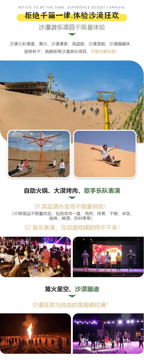 今晚我們將在此開啟沙漠狂歡party!坐上沙漠摩托、沙漠越野,專業(yè)騎手、專業(yè)裝備帶你來一次刺激的沙漠沖沙體驗(yàn),在沙漠中放聲尖叫;還有沙漠七彩滑道、滑沙、沙漠滑索、海盜船、沙漠蕩船、沙漠蹦蹦床、旋轉(zhuǎn)秋千、蹺蹺板等沙漠游樂項目讓你嗨翻沙漠。日落之后沙漠盛宴來襲,自助火鍋、大漠烤肉......菜品酒水全場不限量供應(yīng)。沙漠夜宴進(jìn)行時還有演員歌手表演節(jié)目,做互動游戲。吃飽喝足,酒氣微醺,在沙漠縱情享受一場篝火晚會、沙漠蹦迪,沙漠狂歡與自由的氛圍感拉滿。狂歡結(jié)束后,需要沙漠露營的客人開始領(lǐng)取露營裝備(包括帳篷,棉被),不露營客人,返回酒店休息。