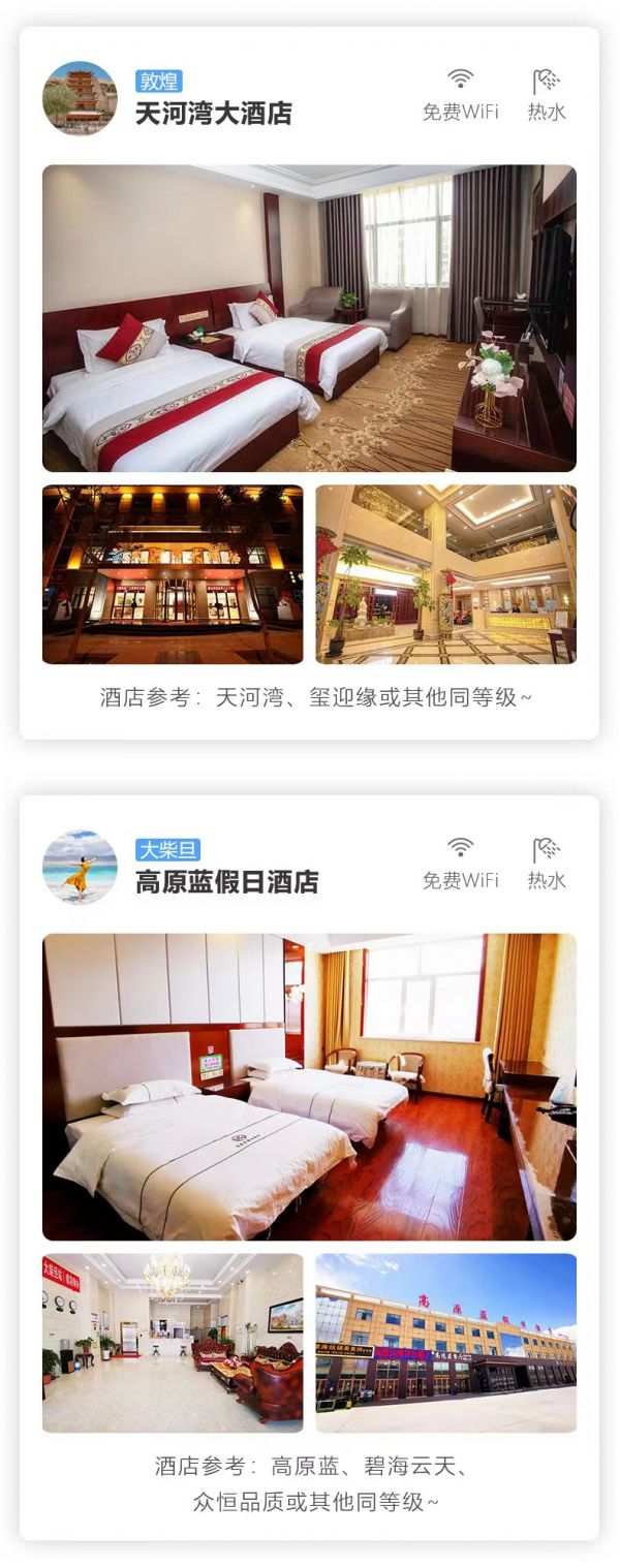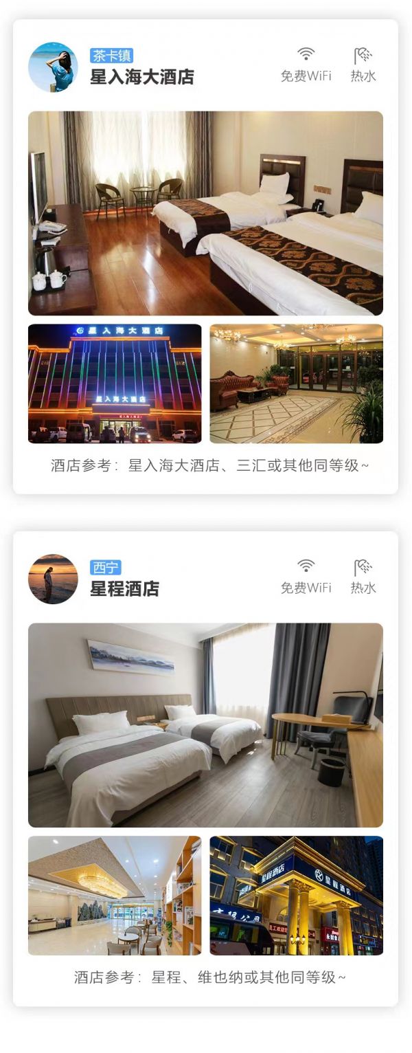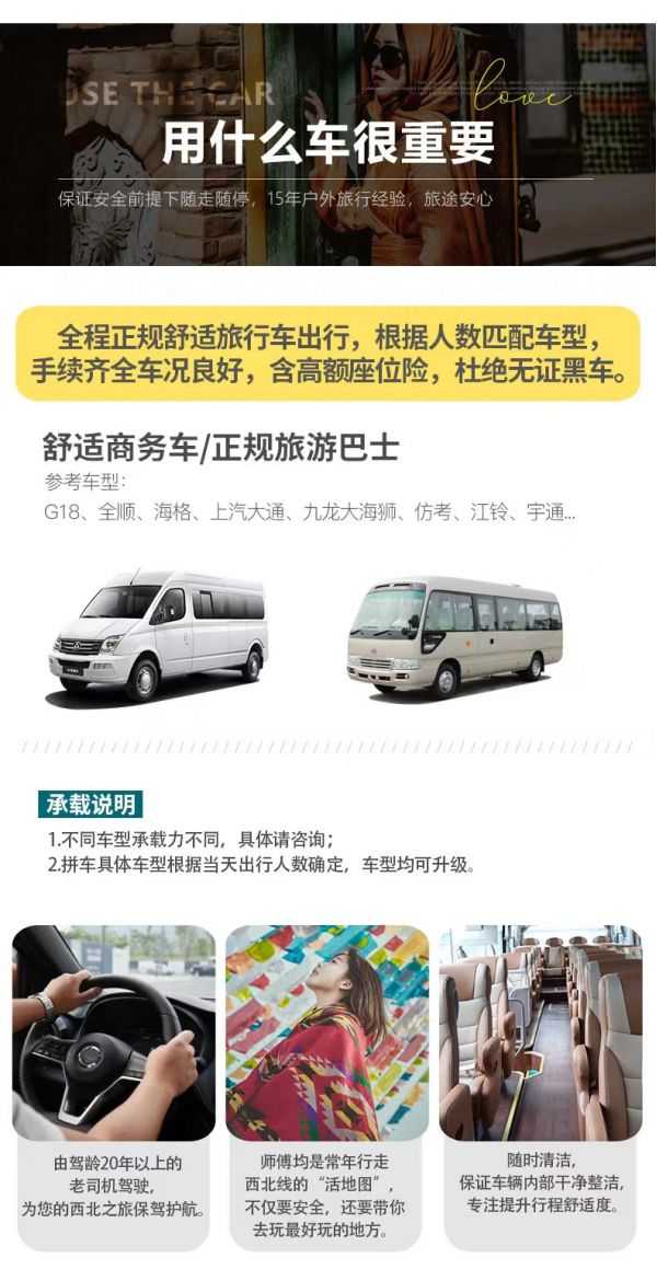 全程正規(guī)舒適旅游巴士,保證一人一正座位,車型大小根據(jù)實(shí)際人數(shù)安排,且由駕駛經(jīng)驗(yàn)豐富的司機(jī)為您的出行保駕護(hù)航(報價包含車費(fèi)、油費(fèi)、停車費(fèi)、維修費(fèi)及司機(jī)勞務(wù)費(fèi))。住宿:行程所列7晚住宿。我們會提供行程內(nèi)展示照片的酒店或其他條件相似酒店,但因沿途條件有限,如酒店設(shè)施達(dá)不到您的期望,請您諒解。參考酒店如下: