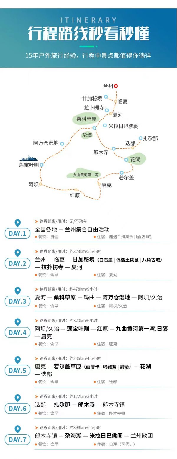 門票:含若爾蓋花湖門票、扎尕那門票、郎木寺門票、九曲黃河第一灣門票、蓮寶葉則景區(qū)門票、拉卜楞寺門票、米拉日巴佛閣門票(優(yōu)惠票說(shuō)明:如持有教師證、軍官證、記者證、傷殘證、老年證、導(dǎo)游證、學(xué)生證等特殊證件,請(qǐng)?jiān)谫?gòu)票前出示,根據(jù)當(dāng)?shù)鼐皡^(qū)政策減免相關(guān)費(fèi)用,相關(guān)優(yōu)惠政策,請(qǐng)?jiān)斣儓?bào)名處)。