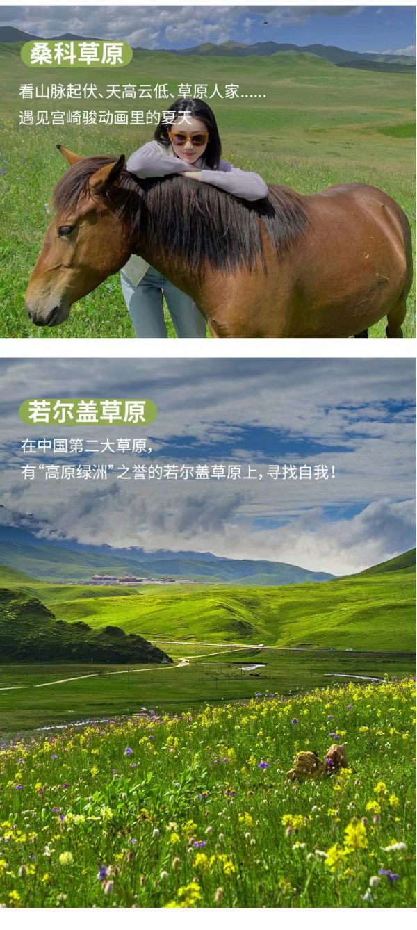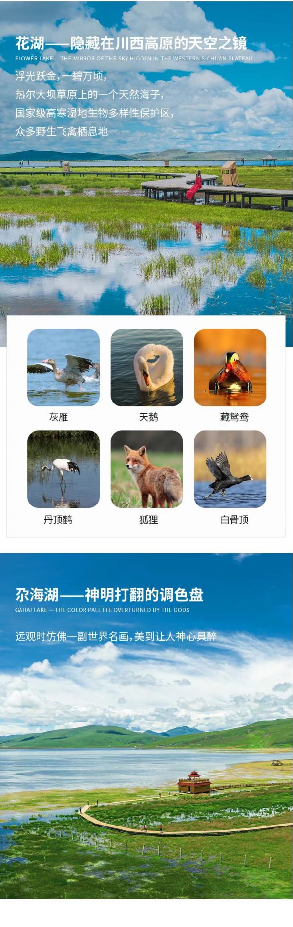 繼續(xù)行程,我們將來(lái)到“中國(guó)最美濕地草原”——【阿萬(wàn)倉(cāng)濕地】,這片濕地臥在甘肅省南部黃河的臂彎里,黃河自西向東從青海久治進(jìn)入瑪曲木西合,因水瀉不暢而形成很多汊河和沼澤,使這片廣袤的草原水草豐茂、牛羊肥壯。這里地處偏遠(yuǎn),但也正因他的閉塞,才造就了這片世界遺落的草原的幽美浩瀚,彎曲的河流,登上觀景臺(tái),俯瞰一望無(wú)垠的阿萬(wàn)倉(cāng)濕地,散落的牦牛、潔白的羊群在茵茵草場(chǎng)上星羅棋布,沼澤在陽(yáng)光下泛著粼粼光波,如同一幀靜止的電影畫面,閑逸至極。從阿萬(wàn)倉(cāng)濕地驅(qū)往阿壩的途中我們會(huì)途經(jīng)??撇菰怄i車觀??撇菰男乱暯?、新體驗(yàn)。