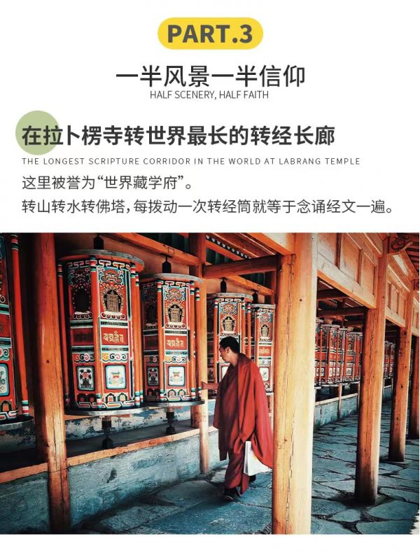 繼續(xù)往前【拉卜楞寺】,有“世界佛學(xué)院”之稱的【拉卜楞寺】。拉卜楞寺是藏傳佛教格魯派六大宗主寺之一 , 規(guī)模僅次于布達(dá)拉宮,是藏傳佛教格魯派最高佛學(xué)學(xué)府之一,被世界譽(yù)為“世界藏學(xué)府”,相當(dāng)于我們眼中的“清華北大”。在漫長(zhǎng)的發(fā)展中拉卜楞寺形成了獨(dú)特的藏傳佛教文化,包括建筑、學(xué)院、法會(huì)、佛教藝術(shù)、藏經(jīng)等,曾經(jīng)是甘、青、川毗鄰地區(qū)藏族的政治、宗教、文化中心。在學(xué)院堪布的帶領(lǐng)下來(lái),進(jìn)入寺院,欣賞美麗的壁畫、唐卡,精美佛像;走過(guò)朱紅玄黃長(zhǎng)廊,和喇嘛一起撥動(dòng)轉(zhuǎn)經(jīng)筒;在這紅白相間的宏偉寺院中,看虔誠(chéng)的信徒磕著等身長(zhǎng)頭來(lái)此轉(zhuǎn)經(jīng);與僧人一起聽(tīng)經(jīng)、打坐,靜靜感受這份信仰的力量。而后經(jīng)過(guò)【瑪曲】,母親河黃河這里自西南入境,復(fù)從西北出境。